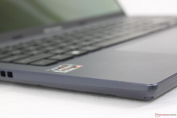 VivoBook 15X OLED använder samma metalllock och plastmaterial som den vanliga VivoBook 15, men med flera designuppdateringar. För det första har Harman/Kardon-logotypen på det högra handflatsstödet ersatts med SonicMaster. För det andra är klickplattan och tangentbordsdäcket större respektive mer definierade. För det tredje har ramarna på alla fyra sidorna minskats för ett något mindre fotavtryck trots den snabbare CPU:n i Ryzen H-serien i vår modell. Och slutligen innehåller den vänstra kanten nya ventilationsgaller tillsammans med omplacerade portar. De två modellerna kan se likadana ut vid en första anblick, men förändringarna är inte obetydliga när man tittar närmare.