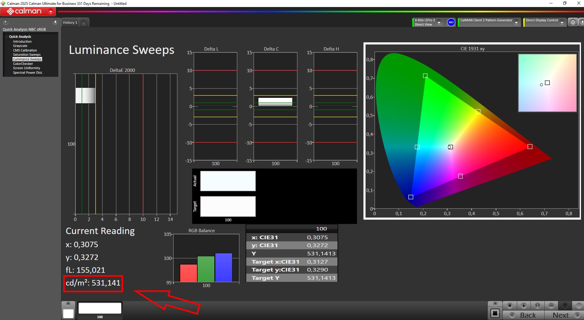 Vid 100% ljusstyrka når panelen ungefär 530 nits.