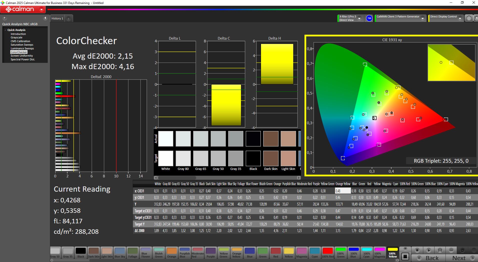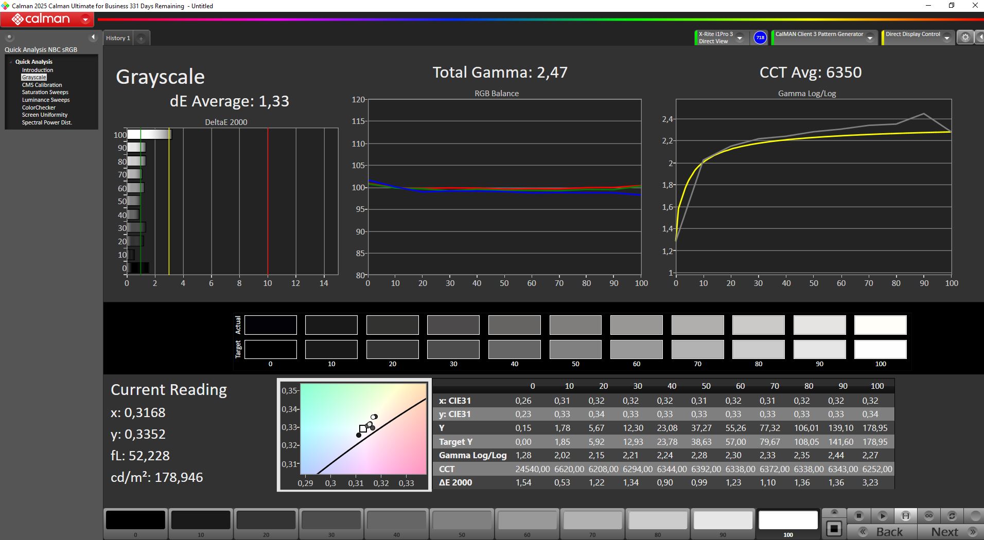 Direkt från förpackningen är skärmen relativt väl kalibrerad. Efter manuell kalibrering minskade avvikelserna i gråskala och färg ytterligare och nådde ett genomsnittligt deltaE på cirka 1,3.
