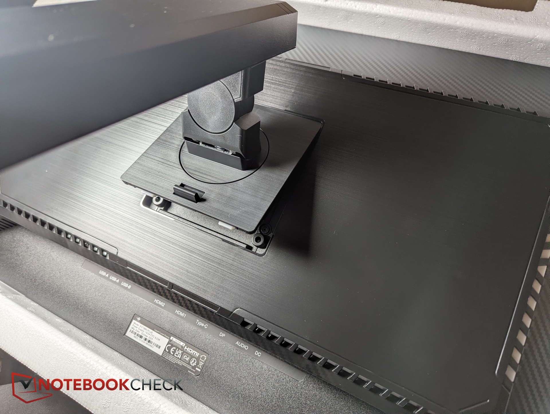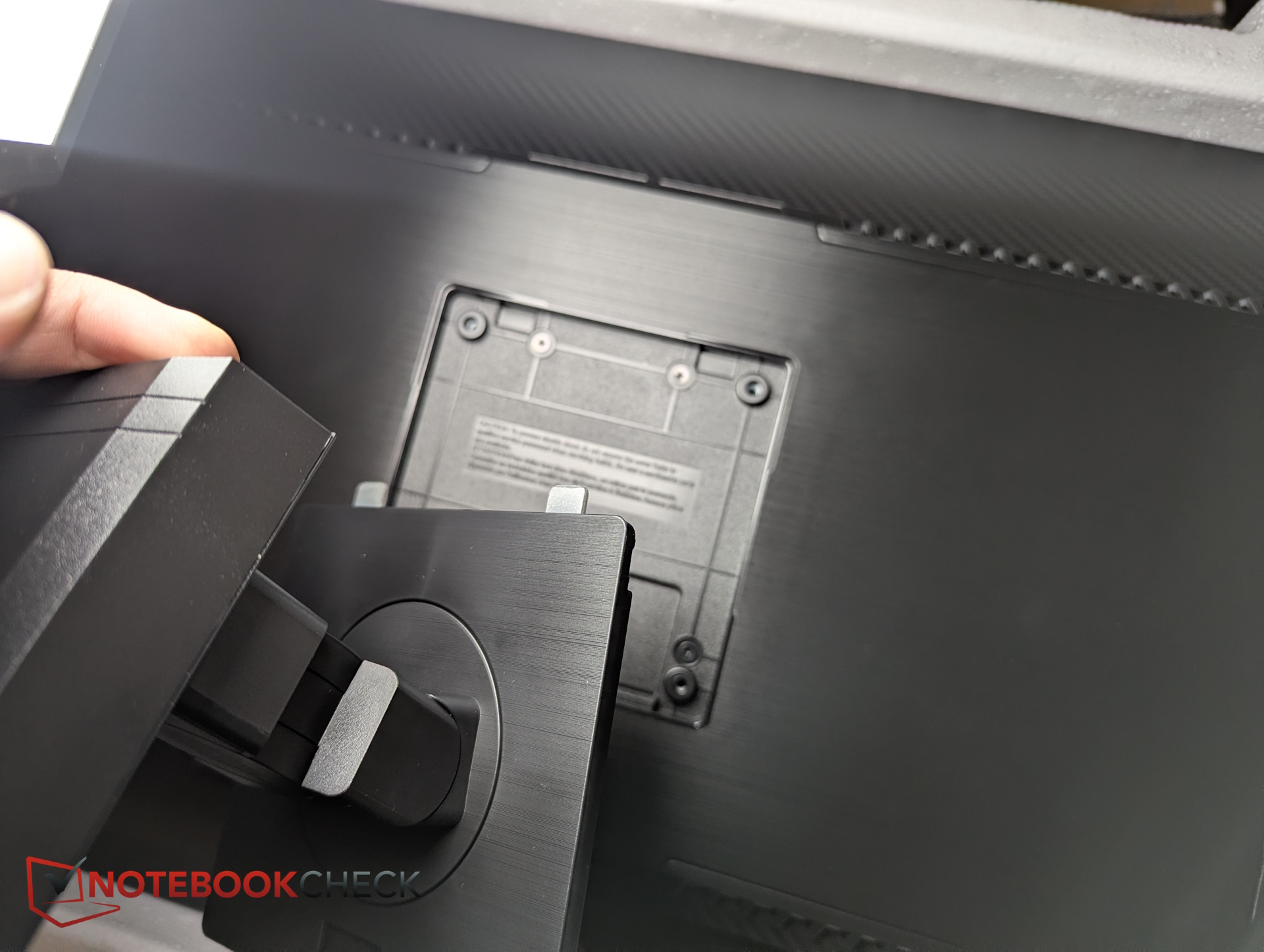 Monteringen är okomplicerad. Stativet klickas direkt in i VESA-fästet på baksidan av skärmen - inga skruvar krävs.