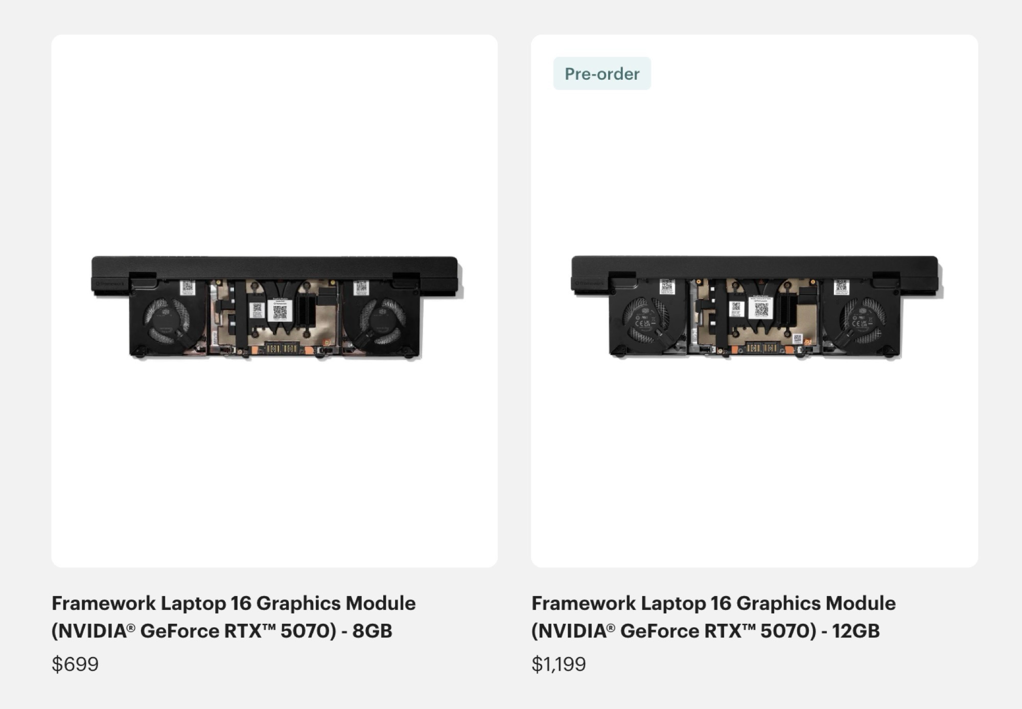 De första bärbara speldatorerna med den här nya versionen av GeForce RTX 5070 kommer att börja levereras under de kommande veckorna, men Nvidia har inte officiellt meddelat priset. Framework har nu öppnat förbeställningar för en GeForce RTX 5070 12 GB uppgraderingsmodul för Framework Laptop 16, som ska levereras från och med juni. Priset är förvånansvärt högt - GeForce RTX 5070 12 GB kostar 1 199 USD istället för 699 USD som varianten med 8 GB grafikminne. Det innebär att kunderna betalar en extra avgift på 500 dollar eller 71,5 procent för 4 GB eller 50 procent mer VRAM.