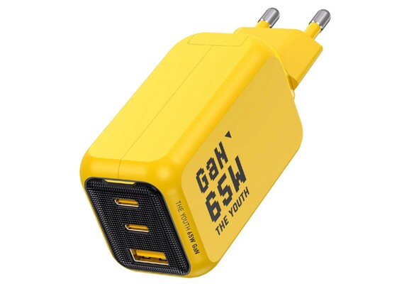 Hur som helst sticker den nya Aohi Youth PD PPS 65W 3-Port Foldable Charger ut visuellt, eftersom de flesta andra produkter i denna kategori är antingen gråa eller svarta. Den här kommer i en slående gul design, men EU-modellen är faktiskt inte vikbar, vilket motsäger dess eget produktnamn. Endast den amerikanska versionen kan vikas för att minska dess dimensioner för transport och förvaring. Med detta sagt är 65-wattsladdaren relativt kompakt som den är och mäter 72 x 43 x 35 mm.