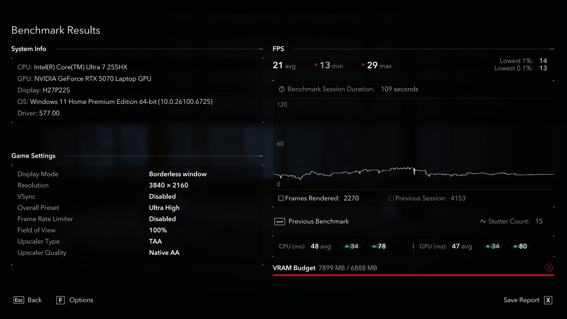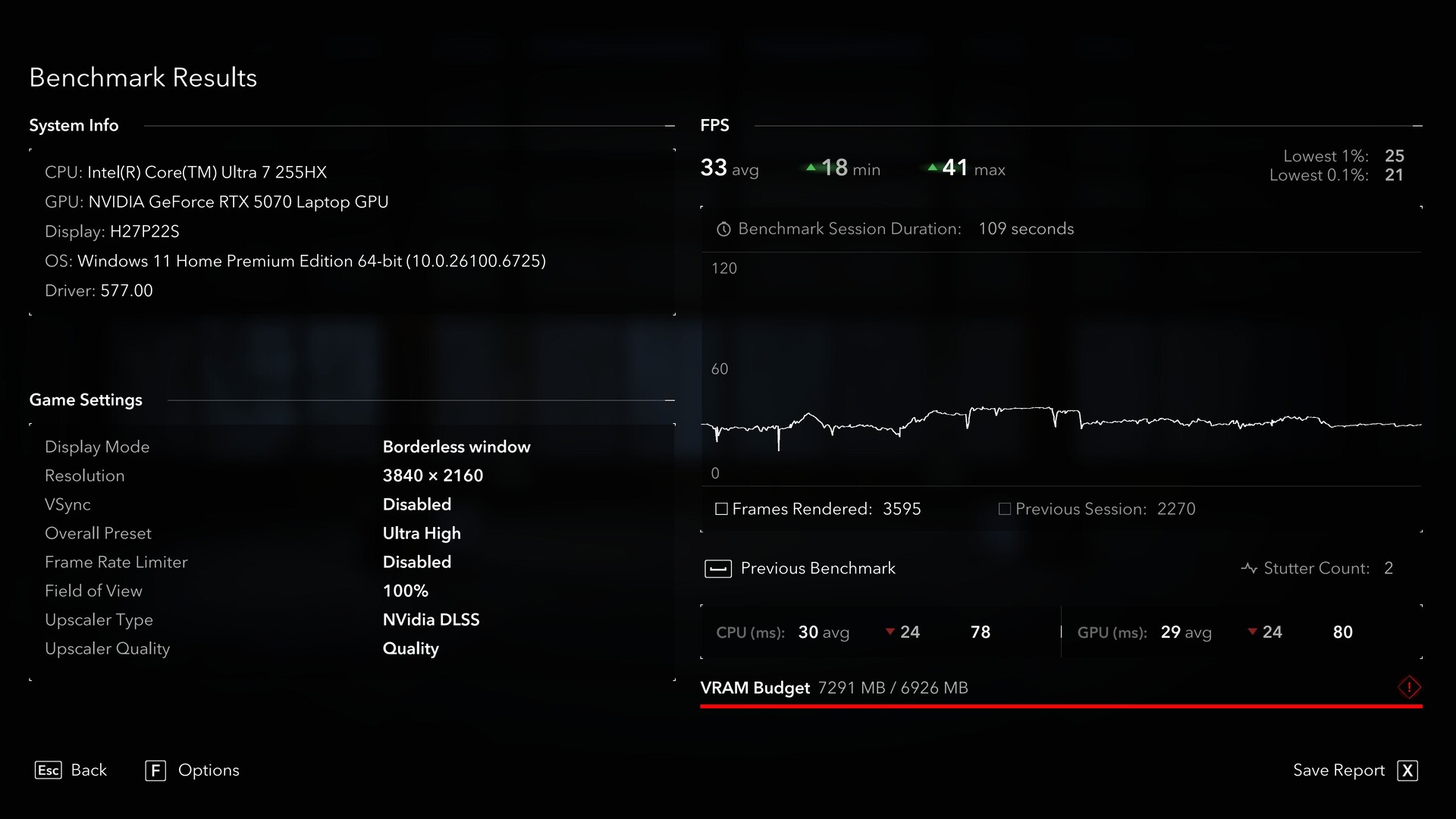 I Assassin's Creed Shadows på 2 560 x 1 440 (QHD) rapporterar spelet att VRAM-budgeten överskrids med cirka 100 MB. I följande benchmark förblir dock bildtiderna stabila - även om den genomsnittliga bildfrekvensen ligger runt 38 fps. Det interna stamningsantalet registreras på bara 1.