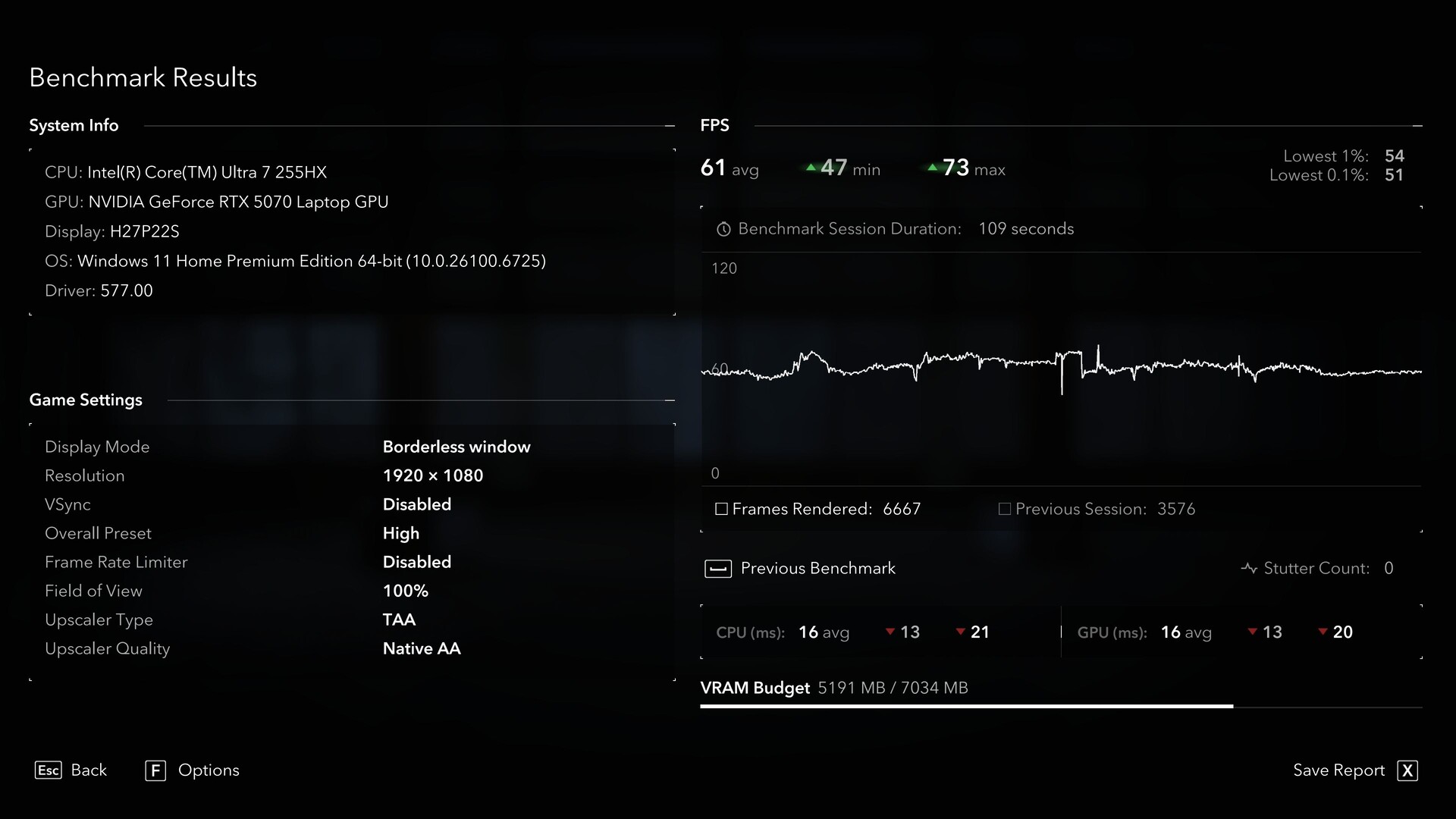 Att byta från native 4K till DLSS Quality-läge bumpar genomsnittet tillbaka över 30 fps och minskar stamningsantalet till 2 - igen, trots att spelet fortfarande rapporterar ett VRAM-överskott. I Full HD på höga inställningar bryts inte VRAM-gränsen alls, stamningsantalet är 0 och prestanda är i genomsnitt 61 fps. Kort sagt, Assassin's Creed Shadows är inte det bästa testfallet för att bedöma VRAM-tillräcklighet, eftersom prestandabegränsningar visas långt innan minnesanvändningen blir ett verkligt problem. Därför är det också mindre av ett problem.
