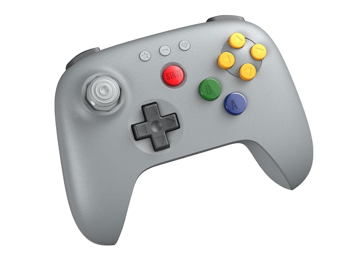 Den grå 8BitDo 64 Bluetooth-kontrollen är utformad för att matcha färgen på den ursprungliga Nintendo 64-kontrollen med sitt gråa skal, gula C-knappar, blå A-knapp, gröna B-knapp och röda startknapp. D-paden tillsammans med axelknapparna och triggers är mörkgrå.