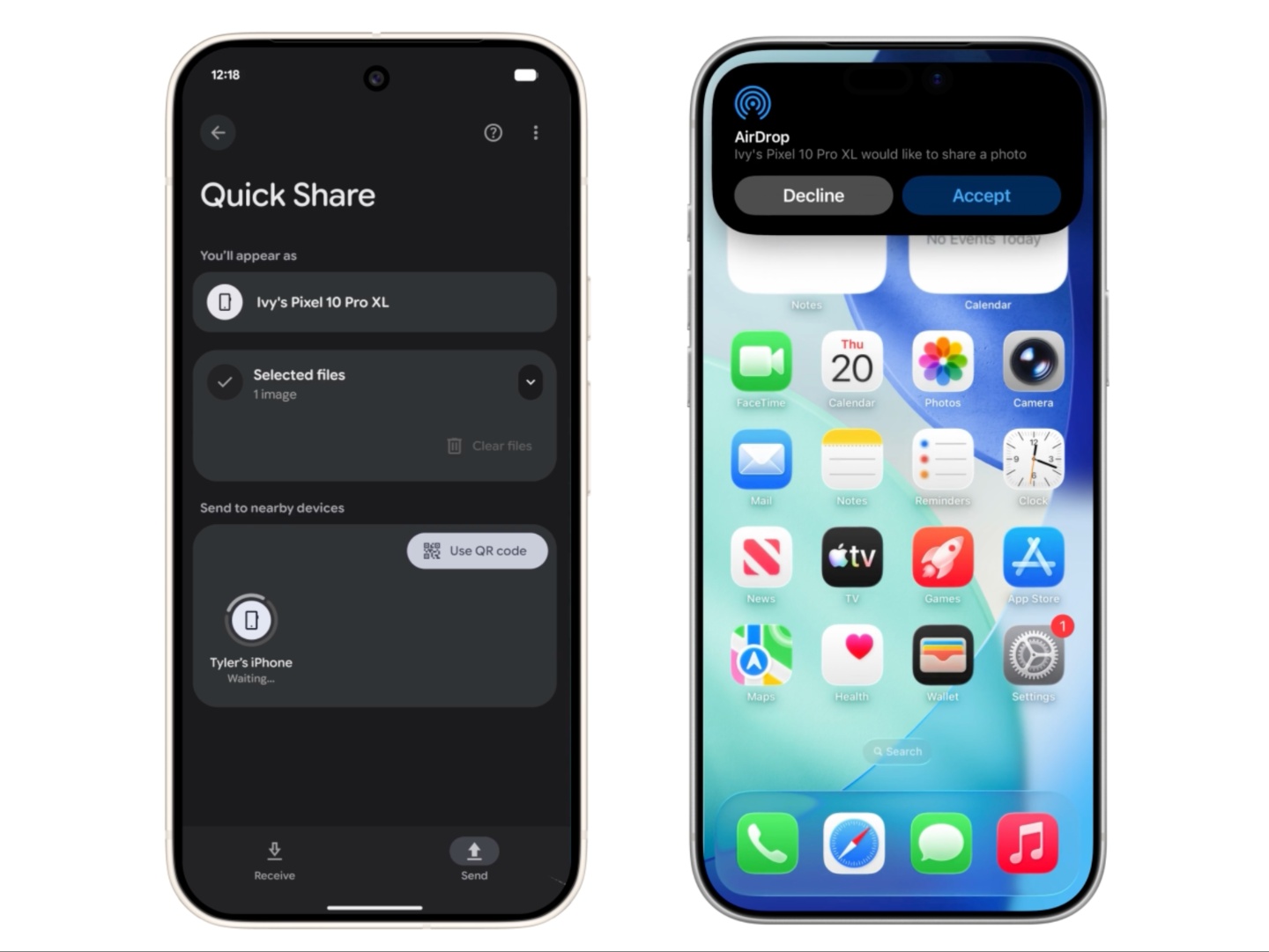 Som visas i animationen kommer Quick Share-menyn att kunna hitta iPhones som har AirDrop påslaget i närheten med synlighet inställd på "Alla i 10 minuter", och sedan enkelt skicka filer över. På samma sätt kan iPhone-ägare, eller vilken Apple -enhet som helst med AirDrop, använda AirDrop-menyn för att dela filer med Pixel 10-enheter i närheten. Google säger att funktionen börjar rullas ut för Pixel 10-serien idag (20 november) och företaget arbetar för att expandera till andra Android -enheter.