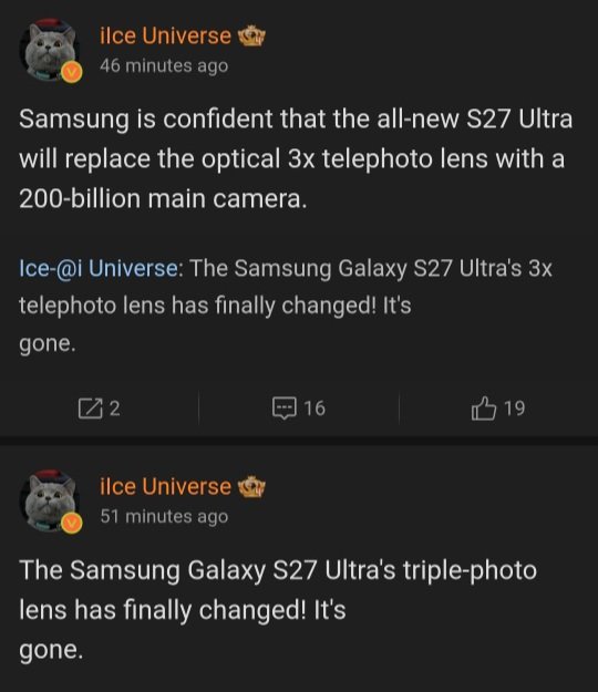 Intressant nog kommer detta en dag efter att Ice Universe publicerade en rendering av Galaxy S27 Ultra och bad om åsikter från communityn om designen. Renderingen hade också tre kameror på baksidan. Så detta får oss att tro att Ice Universe's Galaxy S27 Ultra-rendering kan vara mer än bara en enkel fan-gjord bild.