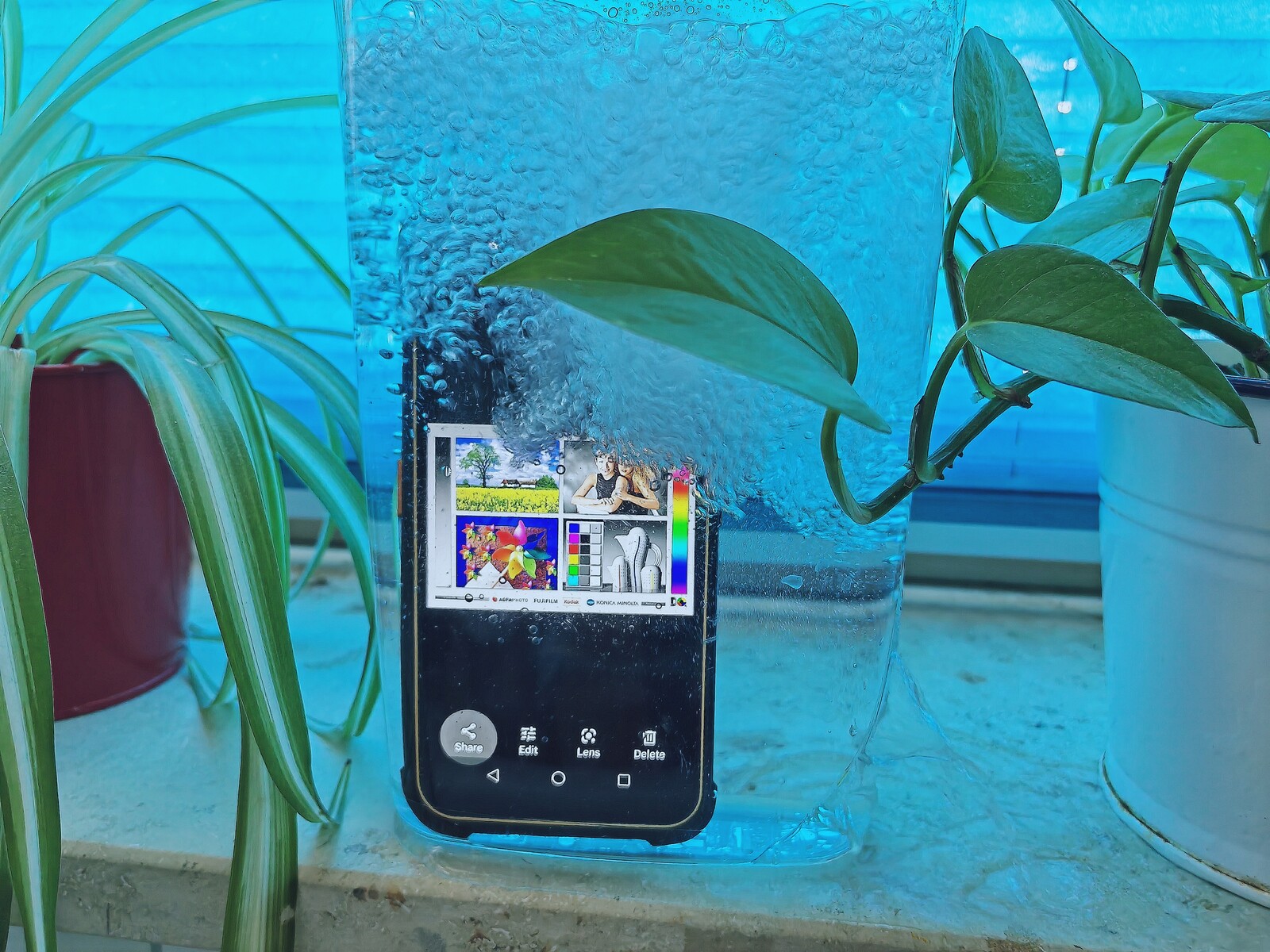 Lustiga stötfångare i hörnen gör att ett fall blir mindre problematiskt, och den utskjutande kanten runt skärmen bidrar också till det. En genomföring för en handledsrem i det nedre högra hörnet finns också. Tillverkaren uppger att telefonen klarar fall från 1,5 meter på betong och tack vare IP69K ska den även klara högtrycksvattenstrålar, är dammtät och klarar upp till 30 minuter i 1,50 meters vattendjup.
