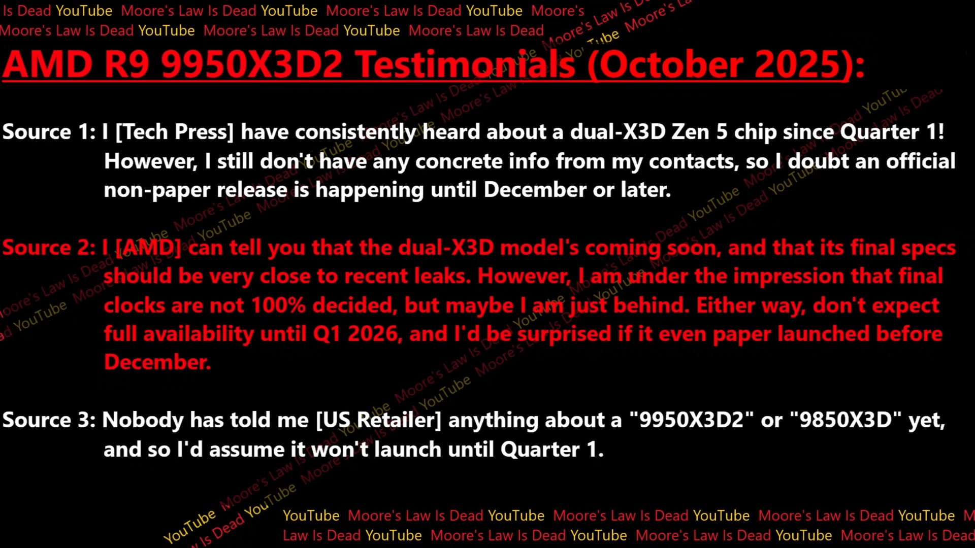 Med information från olika källor inom detaljhandeln, AMD och "Tech Press", rapporterar MLID att den riktiga lanseringen av Ryzen 9 9950X3D2 inte förväntas ske förrän i december. En AMD-källa hävdade att Ryzen 9 9950X3D2 "kommer snart", men att tillgängligheten för återförsäljare inte förväntas förrän Q1 2026. Denna källa bekräftade också att de allmänna specifikationerna som läckt ut tidigare borde vara "nära den slutliga specifikationen". AMD kan dock göra vissa ändringar i de rapporterade klockhastigheterna.