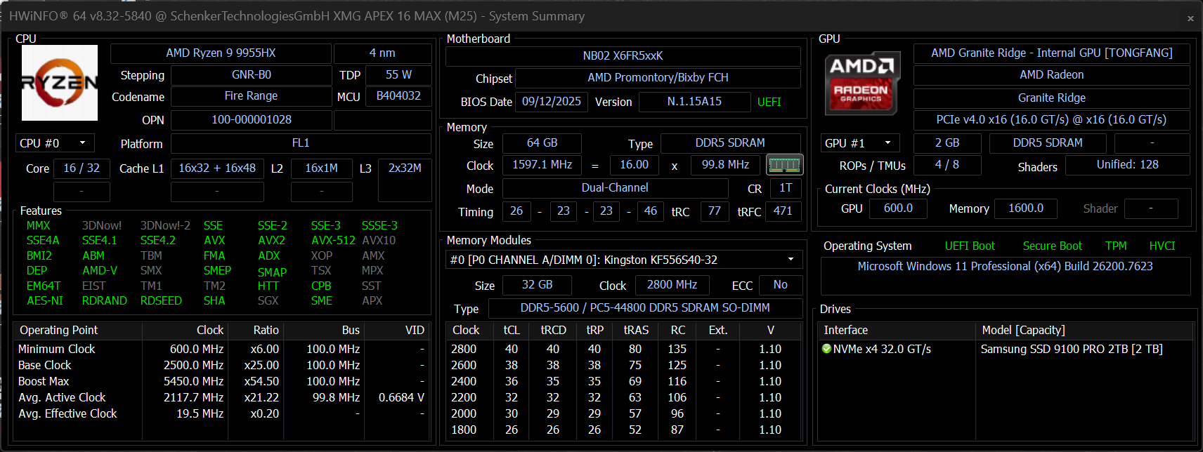 | Schenker XMG APEX 16 MAX AMD Ryzen 9 9955HX ⎘ NVIDIA GeForce RTX 5070 Ti Laptop ⎘ 64 GB Minne, 2048 GB SSD | Listpris: 2815€ | 2.7 kg | 26 mm | 16.00" 2560x1600 189 PPI Mini-LED | |