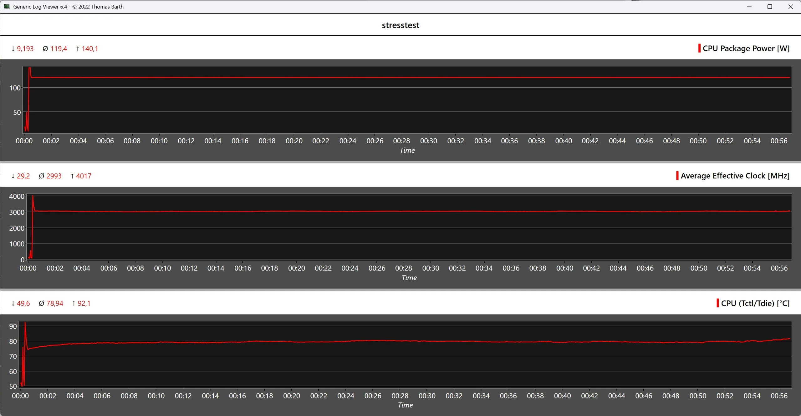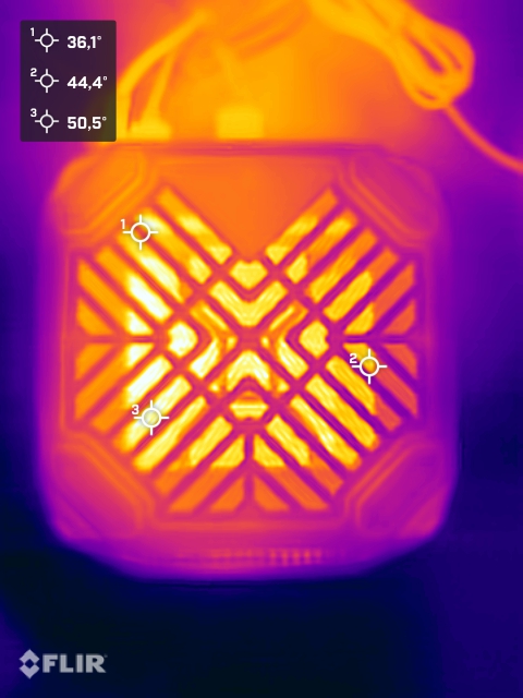 Under belastning värms Acemagic M1A Pro+ endast upp måttligt. På grund av kyldesignen blir baksidan märkbart varmare än alla andra sidor, även om inga extrema hotspots nås här. Själva processorn värms bara upp till över 90 °C under en kort stund när strömförbrukningen på upp till 140 watt används. APU:ns temperatur stabiliseras sedan på cirka 79 °C.