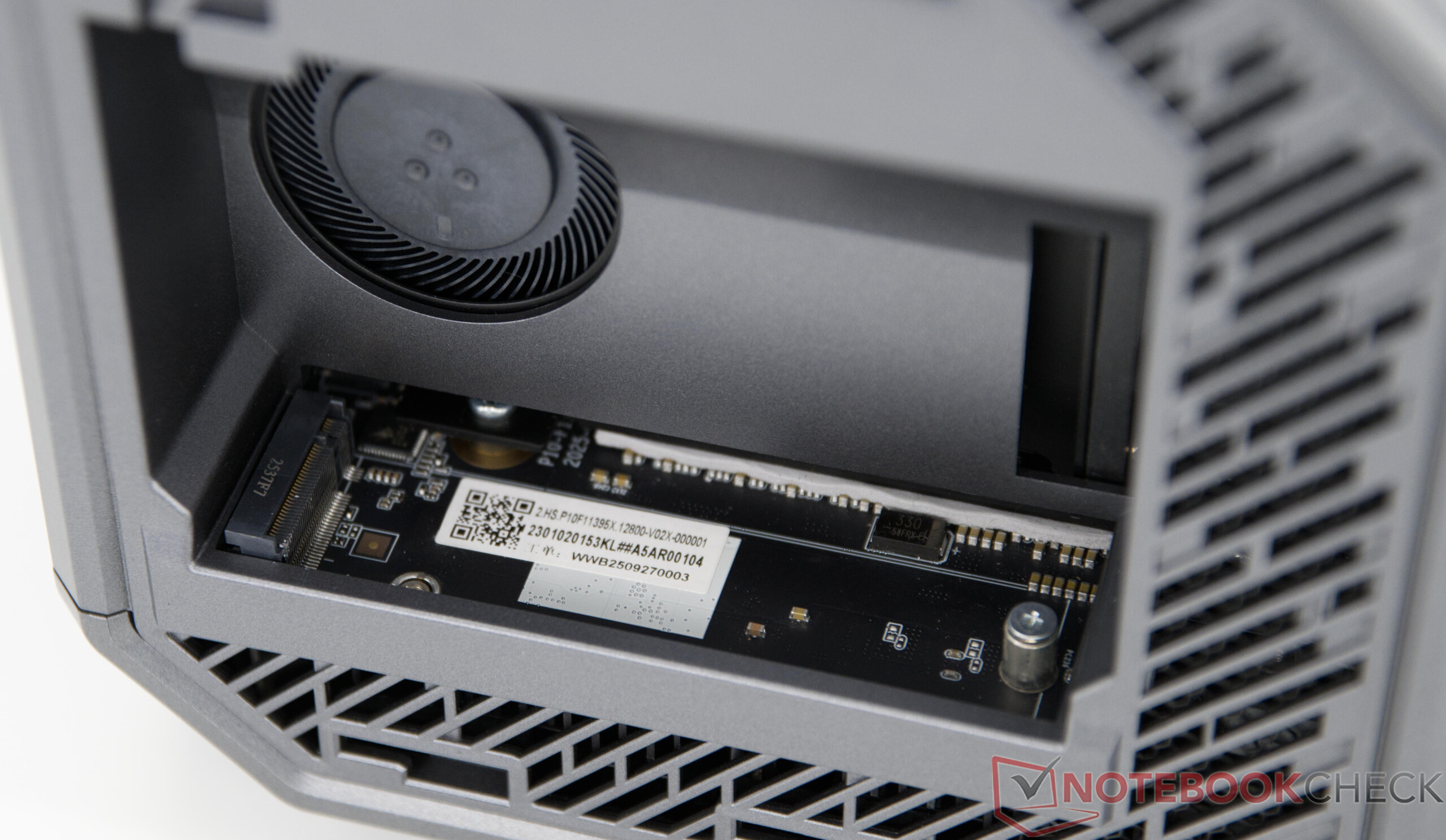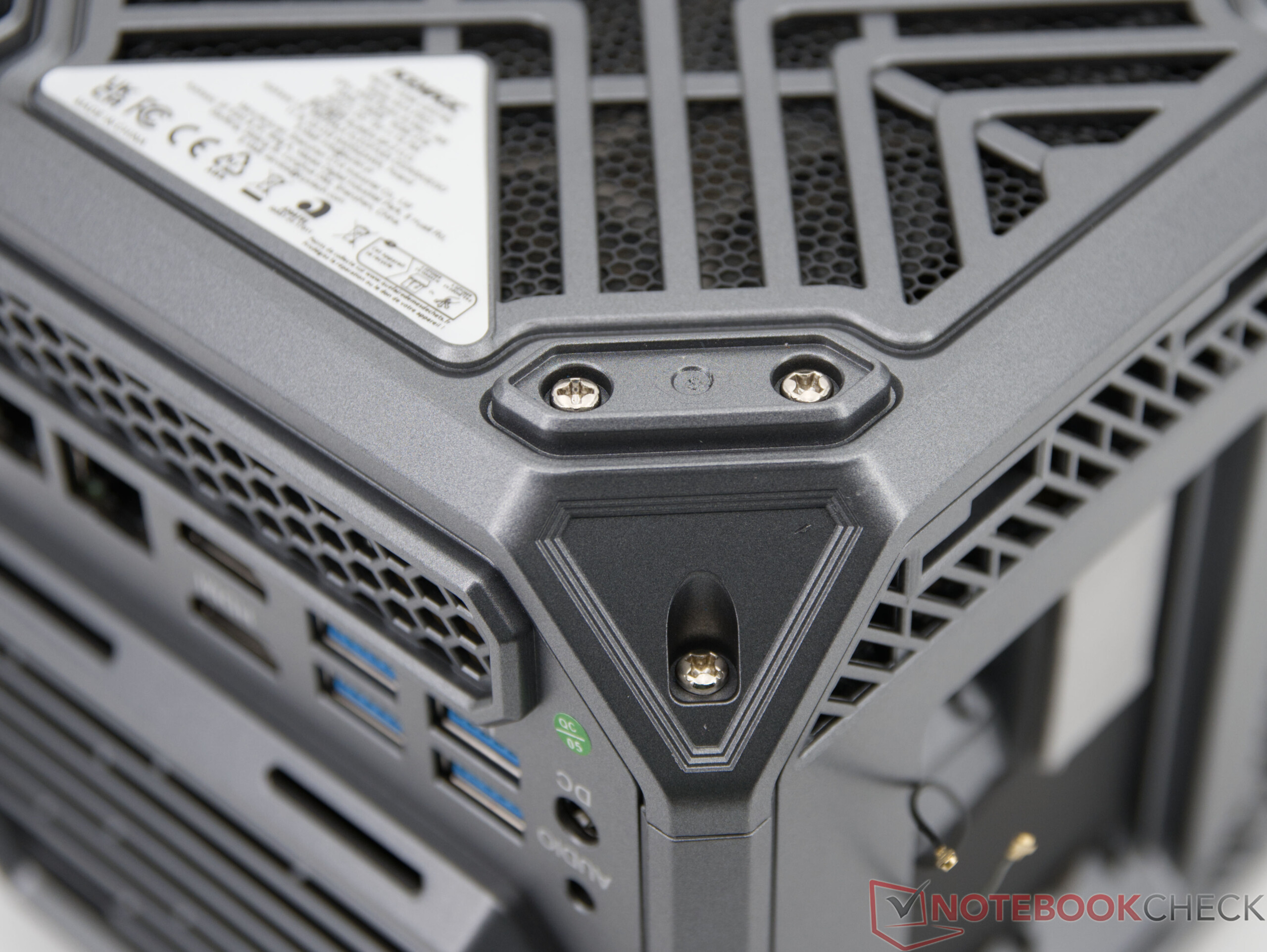 Acemagic M1A Pro+ har två underhållsflikar på sidan som kan öppnas utan verktyg och ger direkt tillgång till SSD- och WLAN-modulen. Det finns fortfarande två fria M.2-platser i vår testenhet. Det är möjligt att helt demontera höljet, även om detta är mycket komplicerat. Många skruvar är placerade under de limmade hörnskydden, som är mycket svåra att ta bort utan att orsaka skador. Varför tillverkaren försvårar fullständig åtkomst till interiören är obegripligt - särskilt med tanke på eventuellt underhållsarbete som rengöring eller fläktbyte.