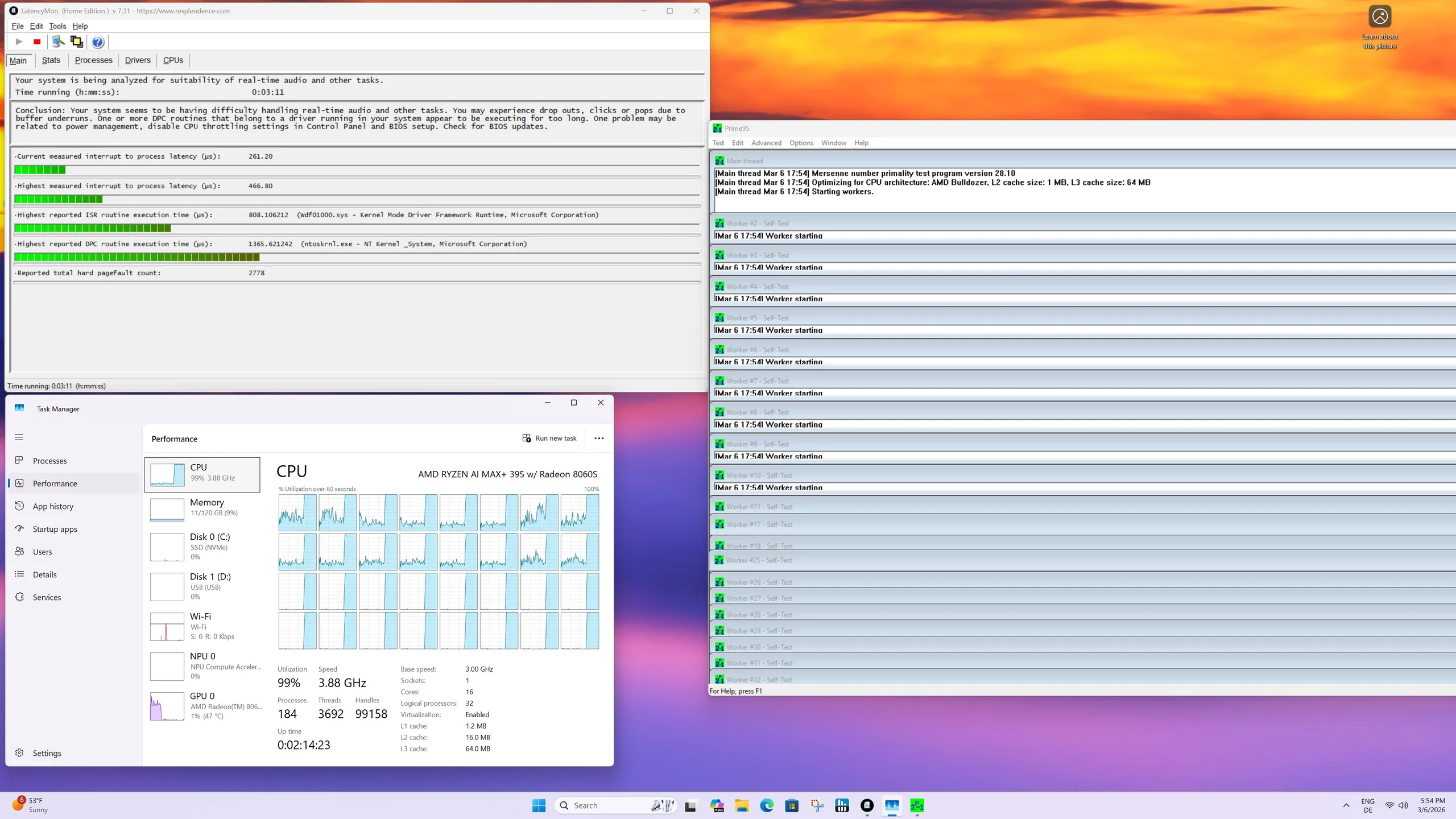 Acemagic M1A Pro+ är utrustad med AMD Ryzen AI Max+ 395, som för närvarande är en av AMD:s mest kraftfulla mobila processorer. I prestandaläge kan SoC:n dra upp till 140 watt under korta perioder men stabiliserar sig på cirka 120 watt under ihållande belastning. Den användarvänliga strömkontrollen via vridreglaget på framsidan av höljet är imponerande i vardagligt bruk. Detta gör att processorns prestanda kan justeras snabbt och enkelt utan att behöva starta om eller justera BIOS. Även i tyst läge erbjuder AMD Ryzen AI Max+ 395 tillräckliga reserver för de flesta applikationer.