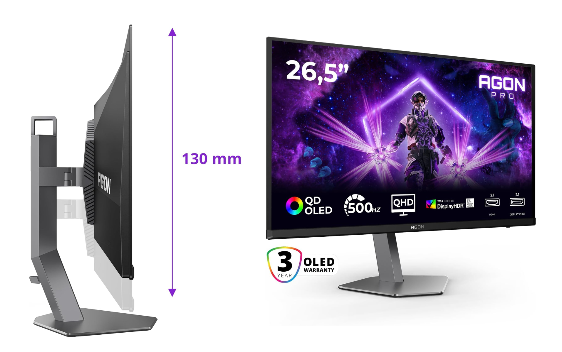 Som vi har diskuterat diskuterat tidigarekombinerar Agon Pro AG276QKD2 sin uppdateringsfrekvens på 500 Hz med en inbyggd upplösning på 1440p över en 27-tums panel. Dessutom integrerar monitorn tre displayingångar med en liten USB-hubb och ett 3,5 mm-uttag. AOC har också inkluderat ett justerbart stativ och täcker mot OLED-inbränning med en 3-års garanti.