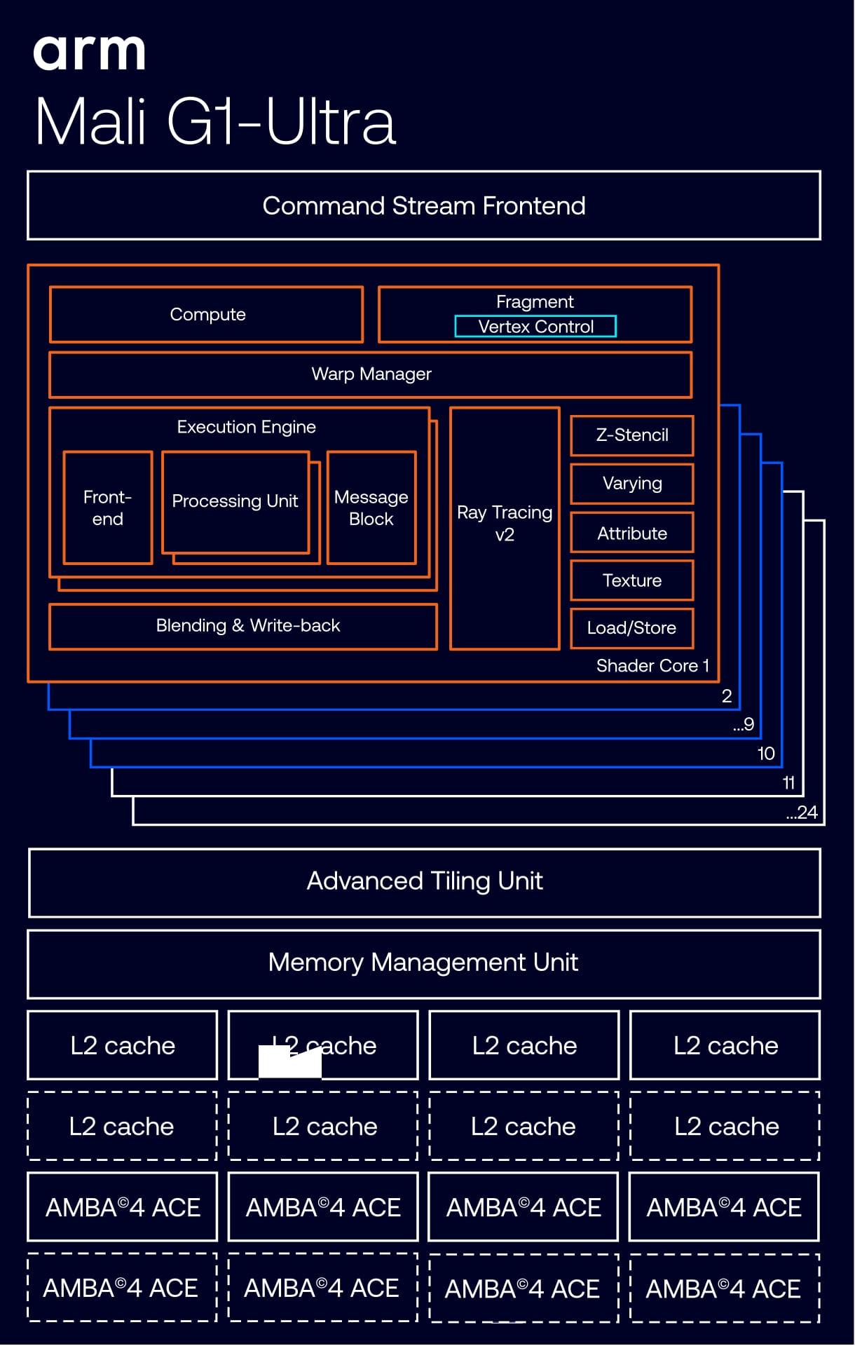| Funktioner | OpenGL ES 3.2, OpenCL 2.0 FP, Vulkan 1.2, ASTC, AFBC |