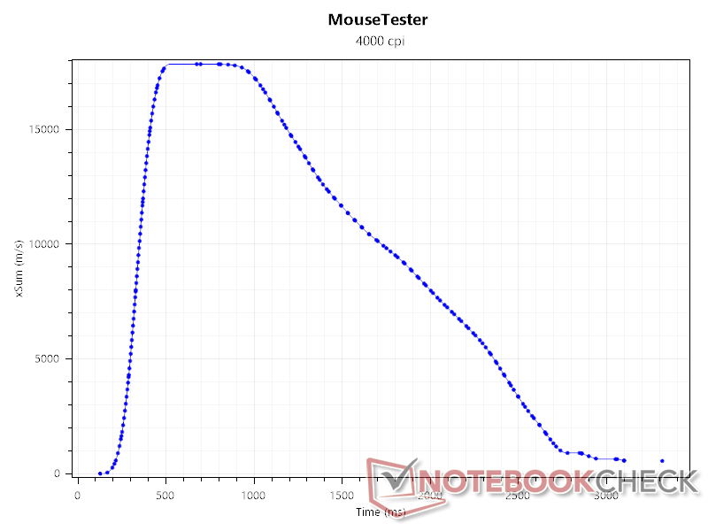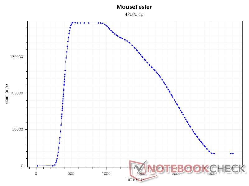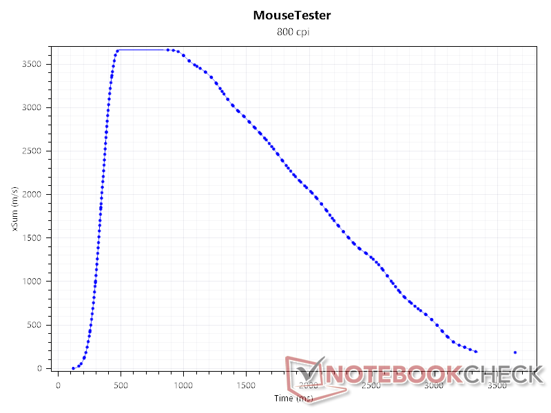 SRAV, eller hastighetsrelaterad noggrannhetsvariation, visar om sensorn har någon inbyggd acceleration. För att testa det accelererade vi snabbt och bromsade sedan långsamt Duckbill Ultra till och från en bestämd position, och observerade följande graf. Sensorn visar inga tecken på acceleration, men data blir lite skeva vid högre DPI-antal.