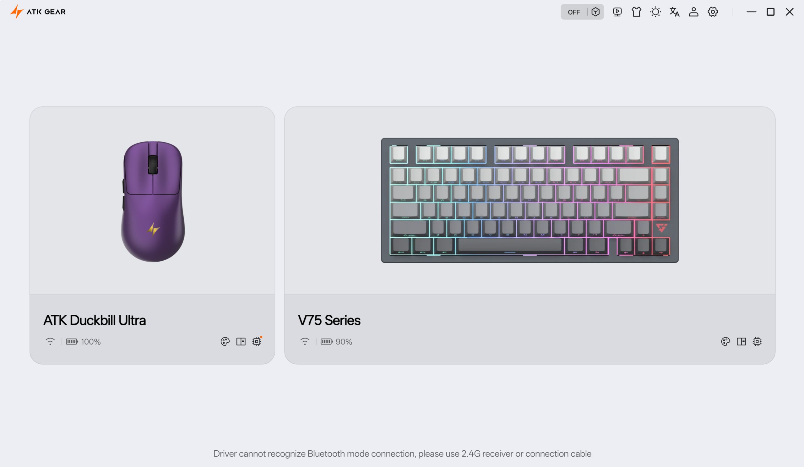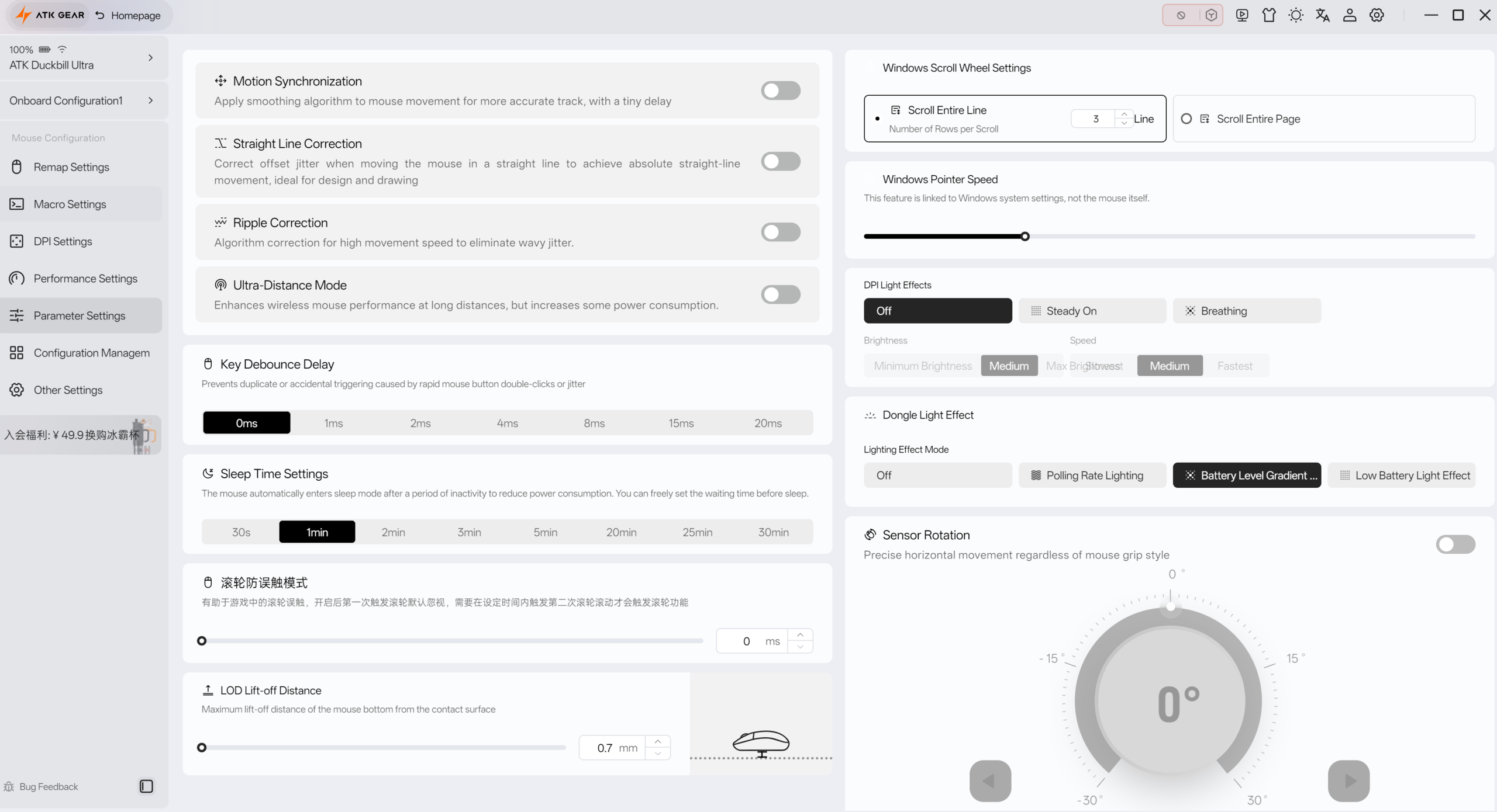Blazing Sky Duckbill Ultra kan konfigureras via ATK Hub, som kan köras online. En offline-klient finns också tillgänglig. ATK Hub erbjuder ett brett utbud av anpassningsalternativ. Den erbjuder en svindlande mängd anpassningsalternativ, till exempel möjligheten att individuellt ställa in olika värden för "X" och "Y" DPI, krusningskorrigering, korrigering av raka linjer med mera.