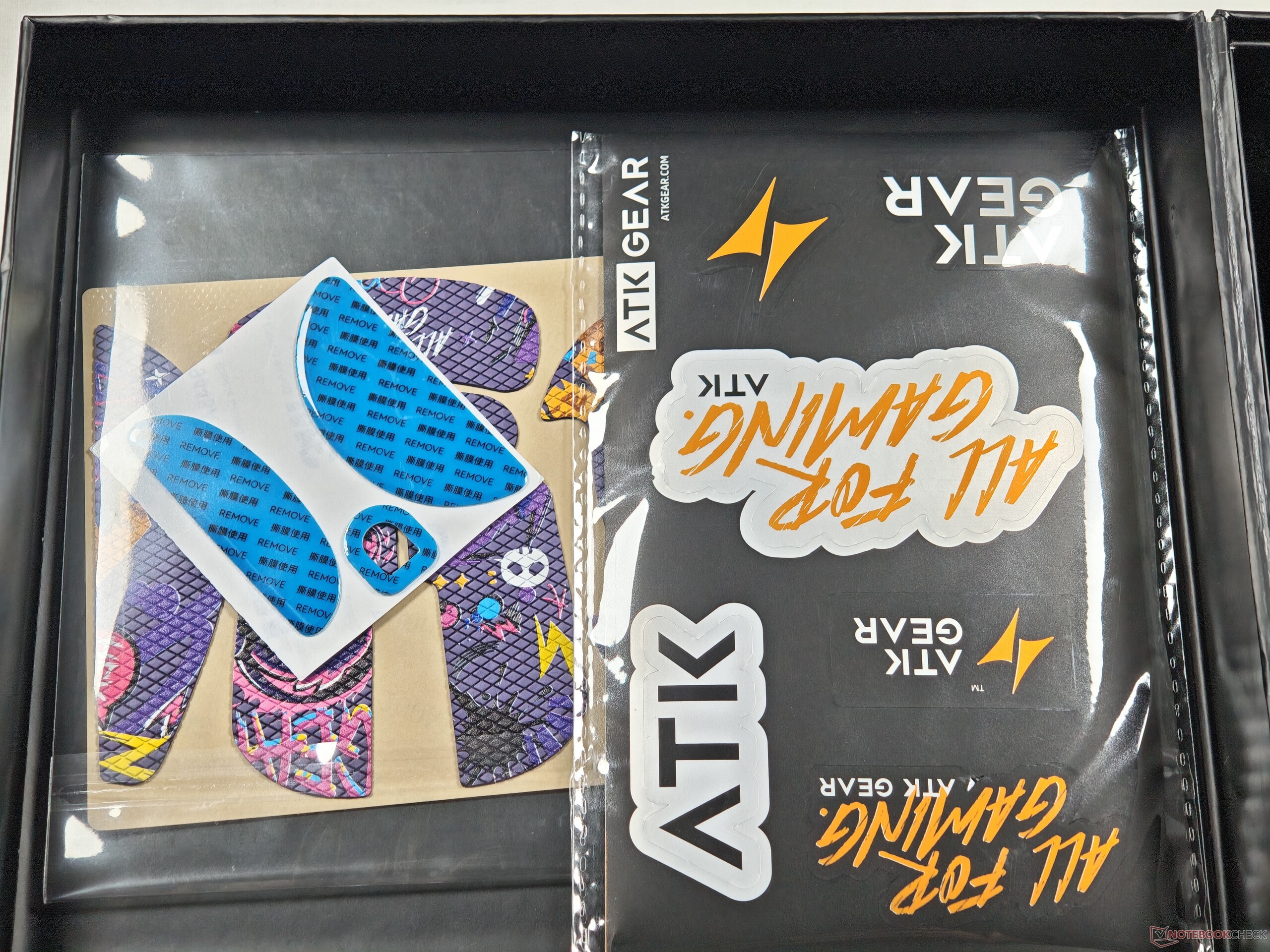 ATK:s förpackning för Duckbill Ultra är flashig, i brist på en bättre term. Den faktiska lådan levereras med en hylsa rik på ATK-varumärke. Inuti får du musen, en USB-C till USB-A-kabel, en dongle, PTFE-fötter och en svindlande mängd klistermärken. Allt presenteras på en skumbas som ger den där extra premiumkänslan.