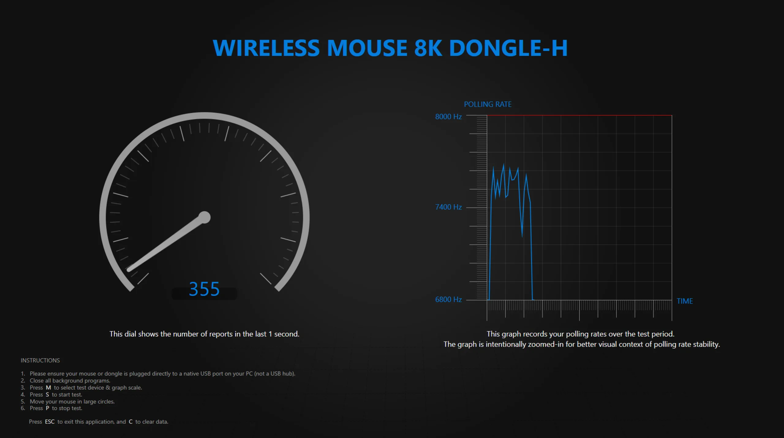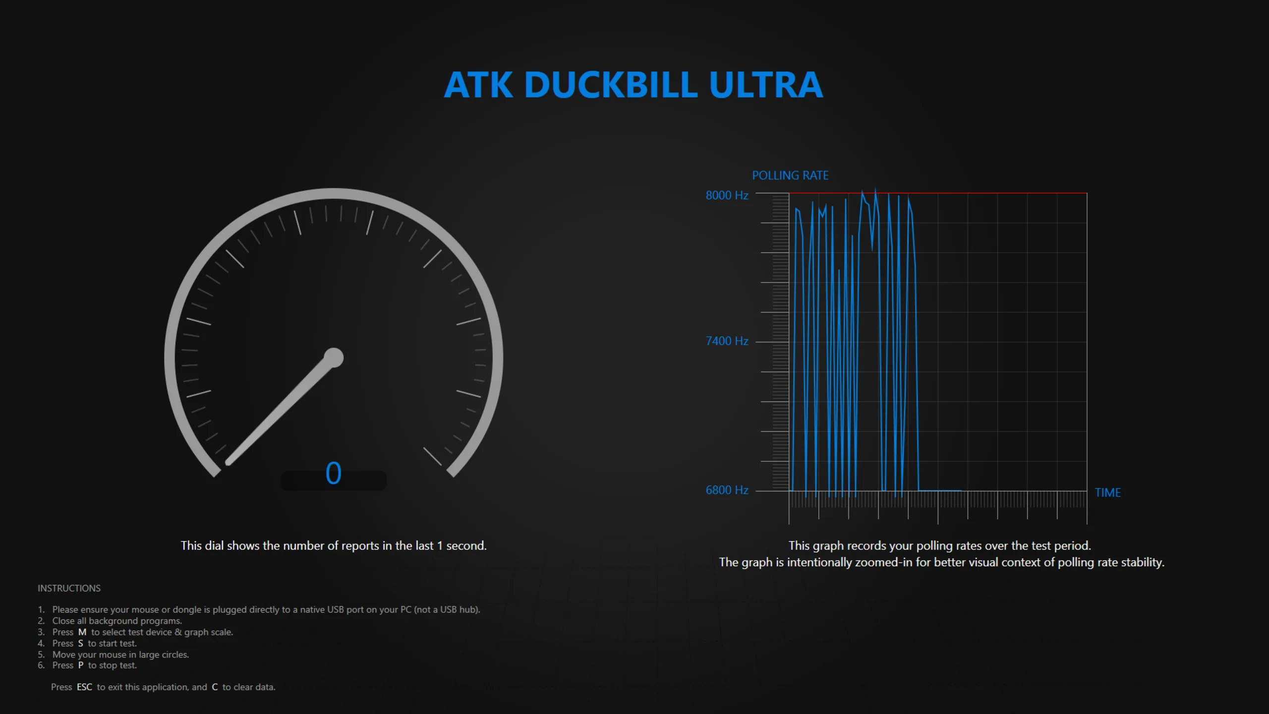 Med hjälp av Razers mätverktyg för polling rate testade vi om ATK Duckbill Ultras sensor fungerar enligt specifikationerna. I trådlöst läge nådde sensorn ett tak på cirka 7 800 Hz, vilket är acceptabelt. Det blev dock lite intressant i trådbundet läge. Under ett kort ögonblick visade verktyget en avläsning på över 8 000 Hz. Spännande, men det bevisar åtminstone att musen fungerar som den ska.