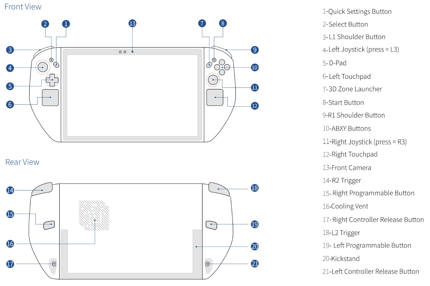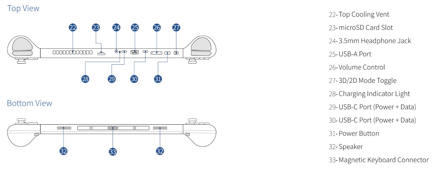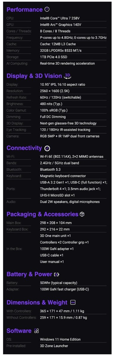 Den har en vikt på 0,87 kg (1,92 lbs.), vilket är liknande en Surface Pro 10 på 0,885 kg (1,95 lbs.). De fullstora spelkontrollerna med Hall Effect-joysticks väger ytterligare 0,24 kg när de är monterade. Precis som Surface Pro kan ett tangentbord och stativ köpas som tillval, vilket gör att 3D One kan användas som en 2-i-1-laptop.