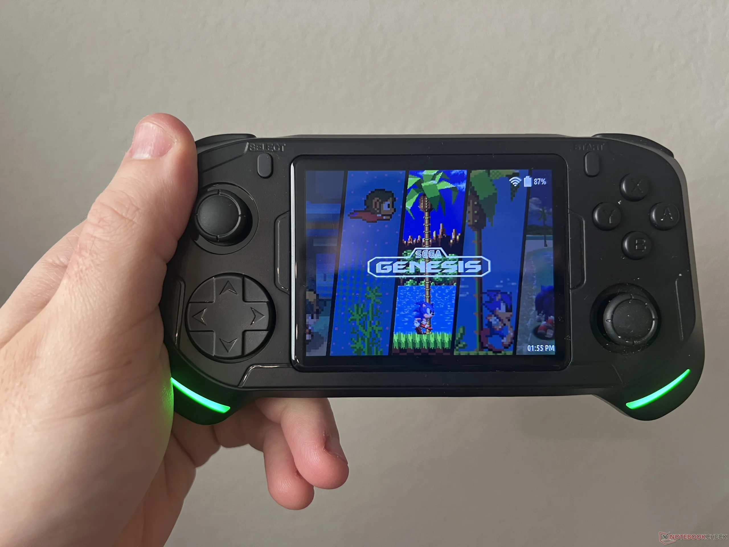 Det finns två gröna LED-remsor längst ner på varje grepp för lite känsla. Färgen kan inte ändras, men den kan ställas in för att vara dim, ljus eller andas. Det finns två inbyggda högtalare på baksidan samt två USB-C-portar (en för laddning, en för anslutning av en kontroller) och ett 3,5 mm ljuduttag längs botten. På ovansidan finns en mini-HDMI-port för anslutning till en TV.