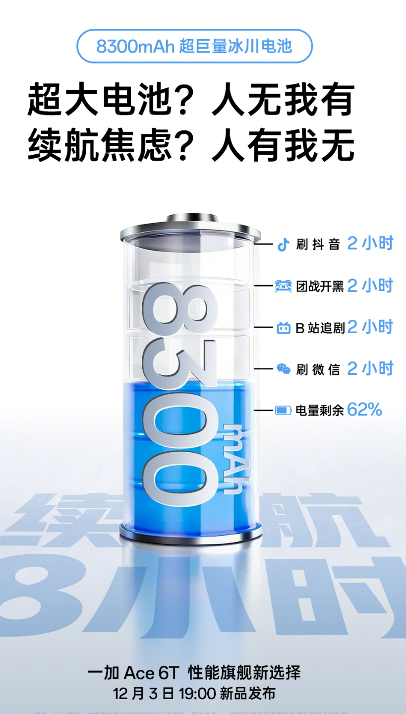 Nu har företaget bekräftat att Ace 6T kommer att ha det största batteriet av alla smartphones som det hittills har släppt. För att sammanfatta, den Ace 6 gjorde anspråk på den kronan förra månaden med en kapacitet på 7 800 mAh för en 500 mAh bump över OnePlus 15. I en ny serie teasers har OnePlus avslöjat att Ace 6T kommer att ha samma fördel jämfört med Ace 6 tack vare ett 8 300 mAh batteri som stöder 100 W trådbunden laddning.