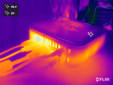 Fallvärmningen av Ace Magician TK11-A0 är mycket begränsad. Kylenheten är dock fortfarande något överbelastad med SoC:n när den använder maximalt 48 watt. I det fallet når SoC 100 °C redan efter några ögonblick, vilket leder till att man måste strypa hastigheten. Fortsätter belastningstestet tar PL1 vid 20 watt över, så att temperaturerna planar ut på i genomsnitt 65 °C (149 °F), vilket inte ger någon anledning till oro.