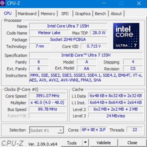 Core Ultra 7 155H-processorn är den övre mellanklasslösningen i Intel Meteor Lake-stacken och kombinerar 6 prestandakärnor med upp till 4,8 Ghz med 8 effektivitetskärnor och ytterligare 2 lågeffektskärnor med en maximal hastighet på 3,8 GHz. Endast prestandakärnorna har hyperthreading så det totala antalet trådar är 22. SoC:n innehåller också en 8-kärnig iGPU baserad på Arc Alchemist-arkitekturen som körs på upp till 2,3 GHz plus en AI Boost NPU som är klockad till 1,4 GHz.