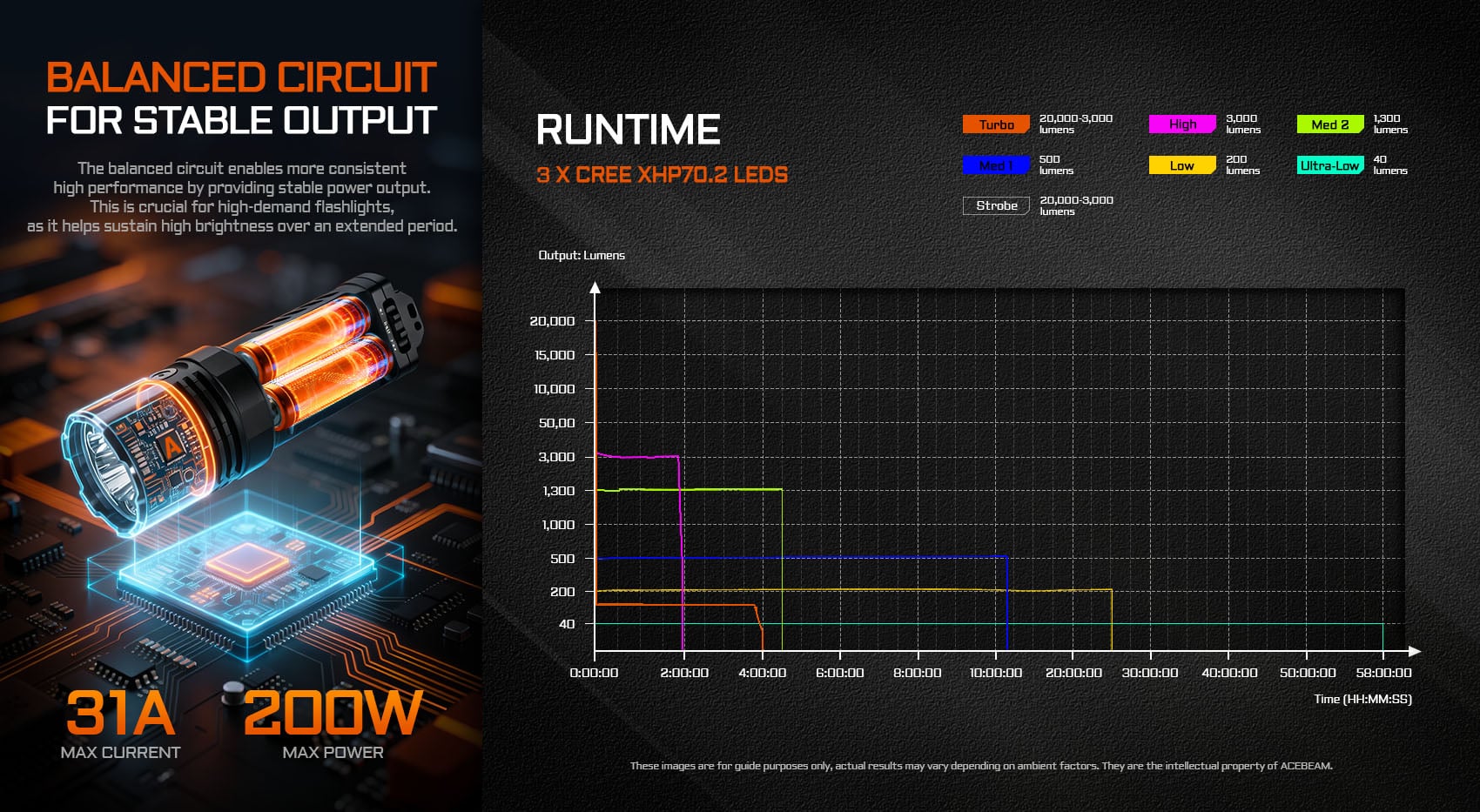 Med detta sagt kan Acebeam X30 bara upprätthålla den maximala ljusstyrkan från sina tre 6500K LED-lampor under en mycket kort tid. Med ett fullt batteri är 20.000 lumen och en räckvidd på över 650 meter tillgängliga i bara 15 sekunder. Efter det levererar high mode 3.000 lumen med en räckvidd på 185 meter i 1 timme och 50 minuter. Om turboläget inte används i förväg varar detta läge 5 minuter längre.