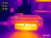 Acemagic AM20 chassits temperaturer ger ingen anledning till kritik. Ändå blir locket varmare än de andra delarna av chassit och detta beror förmodligen på SSD: s värmeavledning. Den som utrustar AM20 med tre masslagringsenheter kommer utan tvekan att uppnå ännu högre värden. I stresstestet med Prime95 varAMD Ryzen 7 7735H nådde ett maximum på 87 °C. Det kan fortfarande betraktas som relativt obetydligt även om vi observerade att SoC: s strömförbrukning inte översteg 35 watt. Det finns en tydligt definierad gräns här som också gäller för Cinebench R15 multi-loop. Prestandagränsen kan dock bibehållas och även efter en halvtimme med kontinuerlig belastning körs processorn på 28 watt.