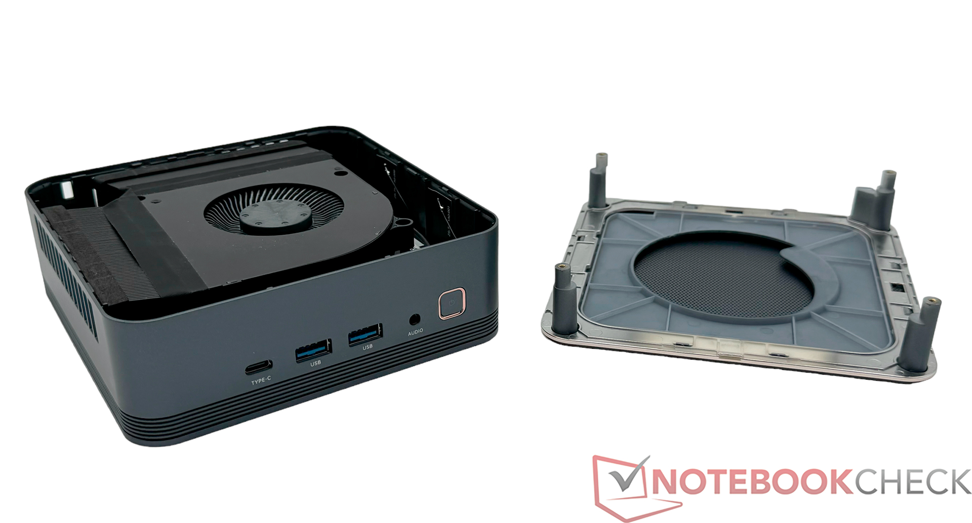 Acemagic F2A säljs endast som ett förkonfigurerat system. Användarens servicemöjligheter är därför begränsade till rengöring och uppgradering av befintliga komponenter. Bottenlocket kan tas bort relativt enkelt efter att du har lossat de fyra skruvarna. Till skillnad från vad vi ofta ser är skruvarna inte dolda under limmade gummifötter, utan istället är det gummifötterna själva som är skruvarna. Som ett resultat kan bottenlocket tas bort utan några verktyg. För att komma åt CPU-fläkten måste du ta isär enheten ytterligare. Hela kretskortet tillsammans med kylaggregatet måste demonteras innan du kan komma åt CPU-fläkten. Du bör dock vara försiktig så att du inte skadar de känsliga anslutningskablarna.