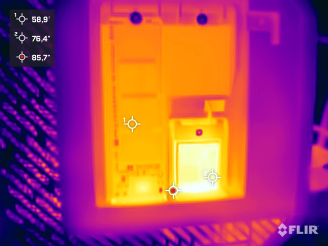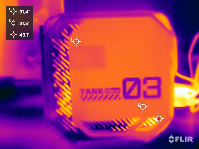 Fallet med Acemagic Tank03 värms upp endast minimalt under tomgångsdrift och även under belastning. Vi mäter något högre temperaturer i området för fläktventilerna på baksidan, även om de fortfarande ligger inom gränserna. De temperaturer vi ser under sidokåporna är betydligt högre. Eftersom värmen inte har något sätt att fly, blir RAM, SSD och även WLAN-modulen mycket varma. Detta förklarar också prestandaförlusterna för SSD under belastning. På vänster sida har Acemagic placerat en extra liten fläkt som är tänkt att ta bort värmen från arbetsminnet ur höljet. Den lilla fläkten skapar dock inte en märkbar luftström, så dess fördel förblir tveksam här.