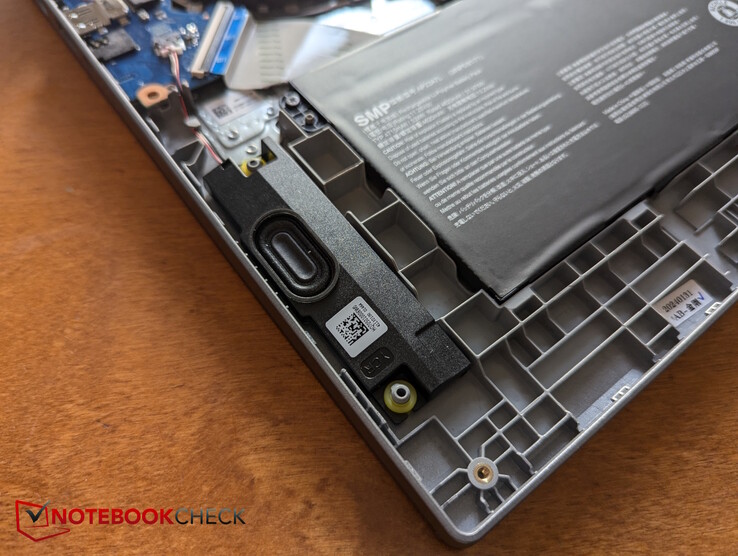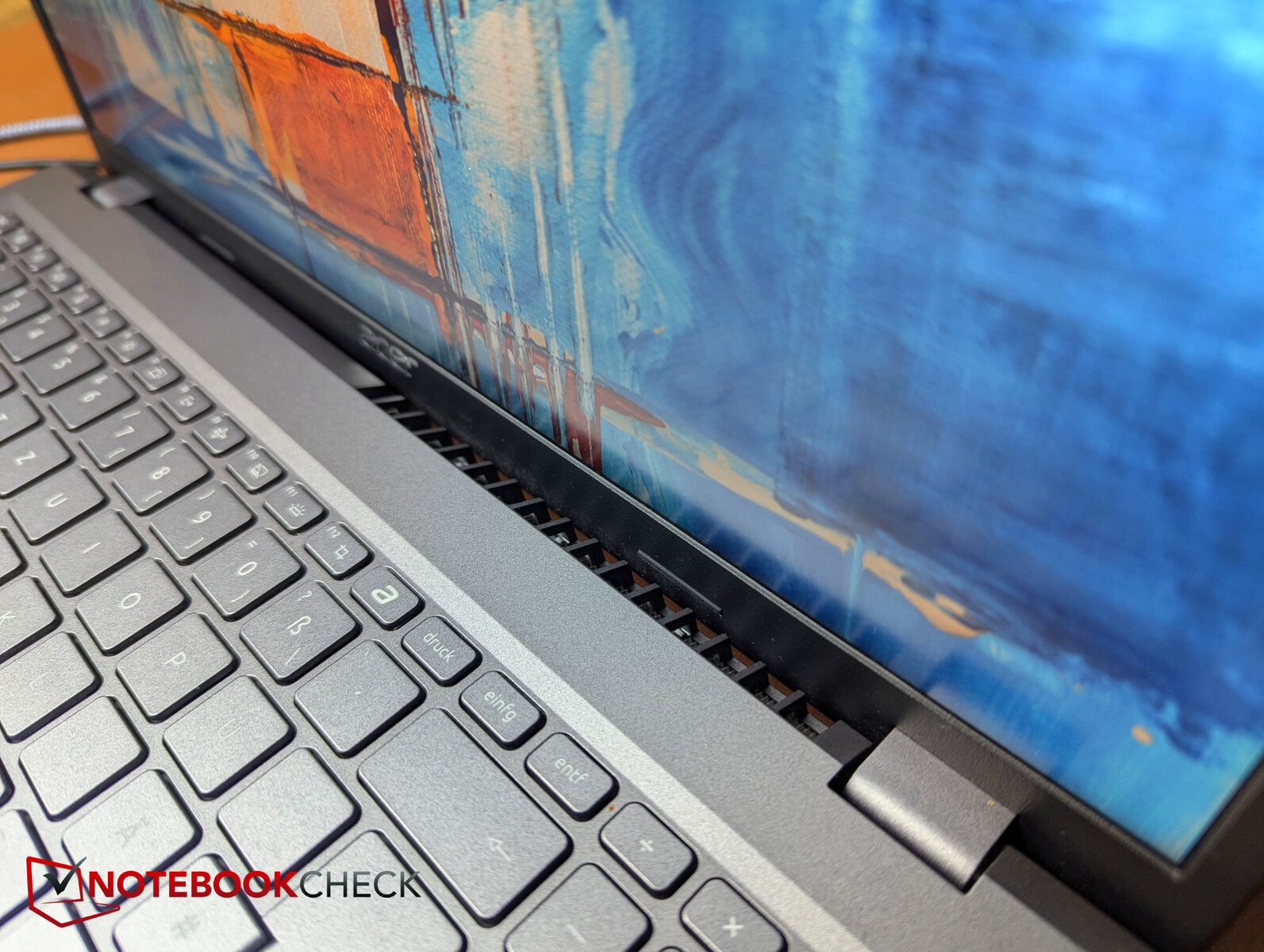 Med hjälp av den något upphöjda fliken i mitten kan du också fälla tillbaka skärmlocket upp till 140 grader med en hand. Gångjärnen är tillräckligt styva för att säkerställa att skärmen inte vickar. Medan aluminium används för locket, är tangentbordsdäcket och bottenkåpan tillverkade av plast. Basdelen knakar när den vrids. Om man trycker på basdelen kan det också orsaka en viss mindre böjning, men inte så mycket att det märks när man skriver. Chassit har inte heller några anmärkningsvärda luckor; den bärbara datorn har överlag en hyfsad byggkvalitet.