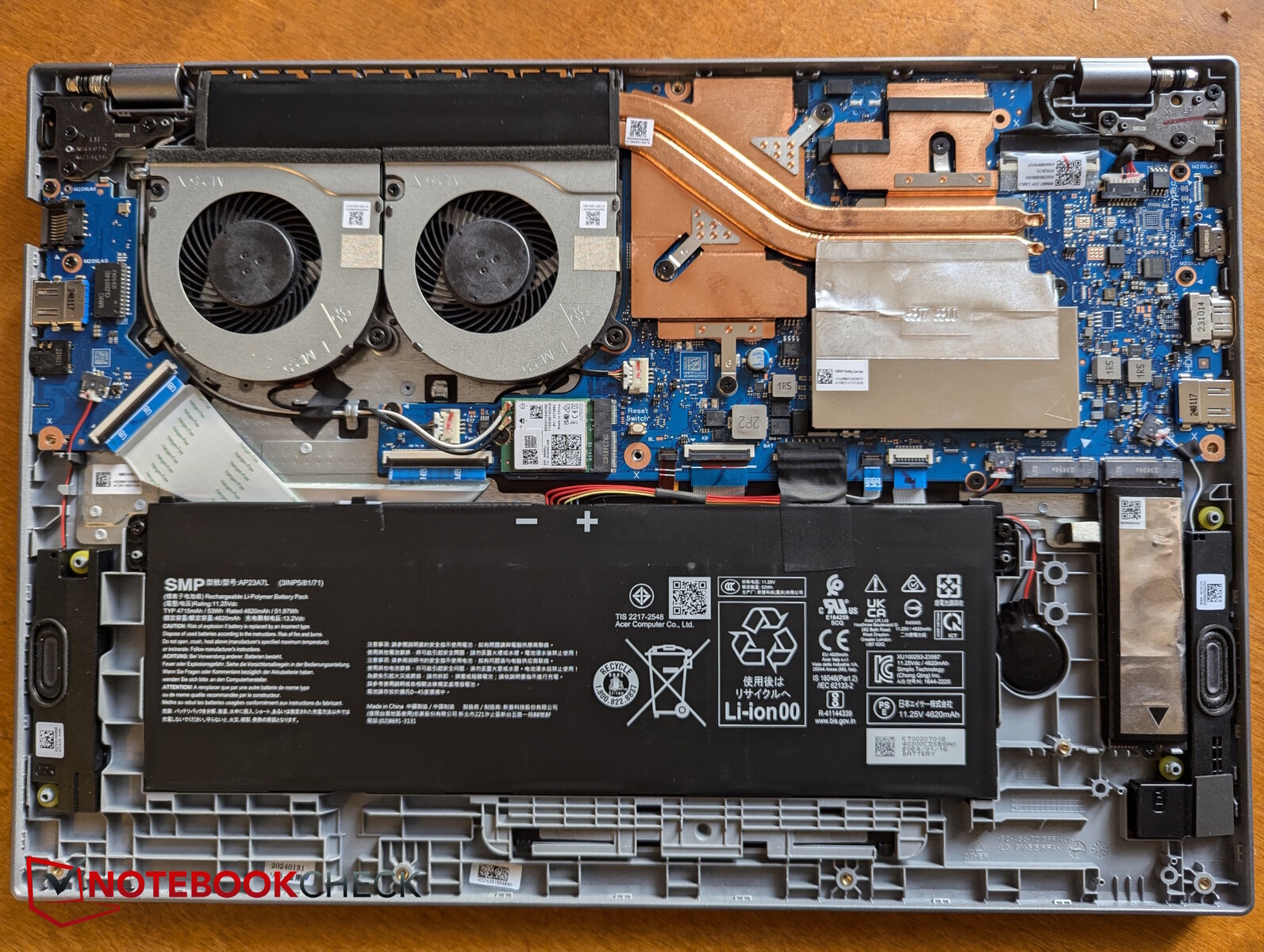 Trots sitt ganska blygsamma pris har den bärbara datorn från Acer en Thunderbolt 4-port, men erbjuder bara totalt tre USB-portar, varav två är USB-A. Det finns ingen SD-kortläsare ombord. Strömkontakten är mycket tunn och kan lätt glida ut. Alla externa kontakter är fördelade över vänster och höger sida; baksidan är reserverad enbart för luftkylningssystemet, men utblåsningsventilerna är endast placerade i den högra änden.