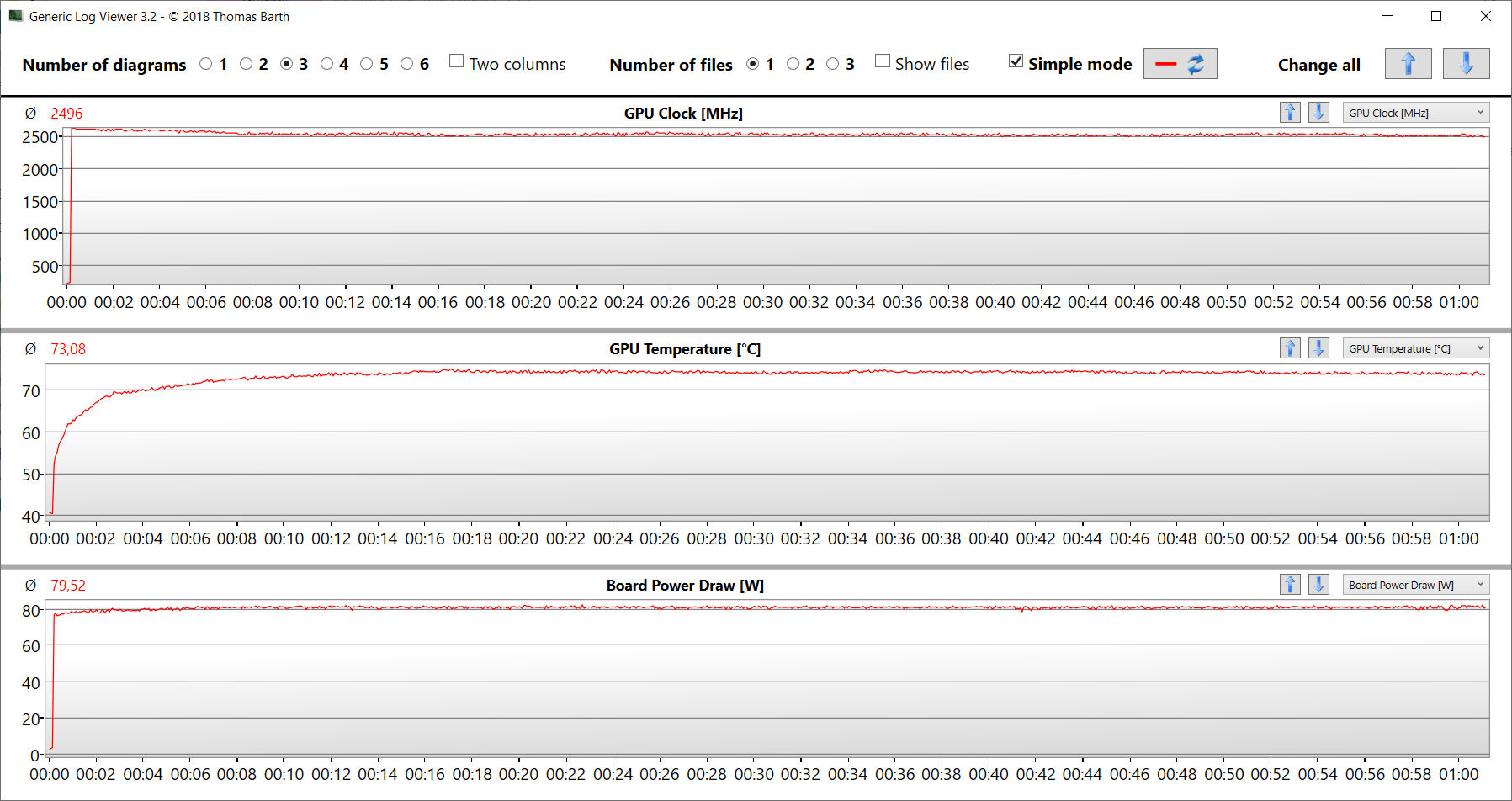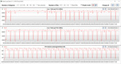 Stresstestet (Prime95 och Furmark i kontinuerlig drift) är ett extremt scenario för att testa systemets stabilitet under full belastning. Processorn startar stresstestet med klockfrekvenser på 4,1 till 4,2 GHz, grafikkärnan körs på 2,3 till 2,4 GHz. Klockfrekvenserna sjunker till 2,6 GHz (processor) och 2,2 GHz (grafikkärna) under testets fortsatta gång.