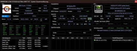 Efter att tidigare ha testat en modell medCore i7-13700HochGeForce RTX 4060tar vi nu en titt på den bärbara datorns likadana bror, AN17-41-R9LN med en AMD-processor och en något kraftfullareGeForce RTX 4070(även 8 GB GDDR6 VRAM). I likhet med Intel-versionen används en 16: 9 QHD-panel med en uppdateringsfrekvens på 165 Hz och en upplösning på 2.560 x 1.440 pixlar som skärm. Dessutom finns 2x 8 GB DDR5-4800 RAM-minne och en 1 TB NVMe SSD installerad. Det finns heller inga överraskningar i operativsystemet med Windows 11 Home installerat på den bärbara datorn.