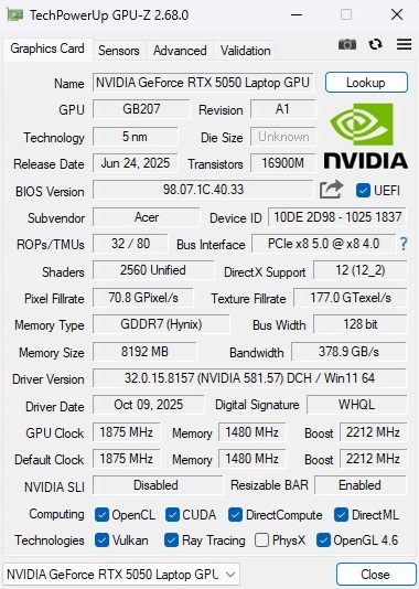 Den tidigare generationen Nitro V 16 med GeForce RTX 4060 GPU för bärbar dator visas också i tabellerna som en jämförelseenhet.