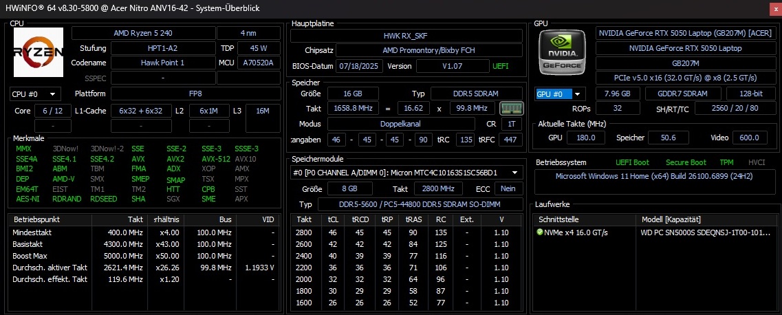 | Acer Nitro V 16 AI ANV16-42-R860 AMD Ryzen 5 240 ⎘ NVIDIA GeForce RTX 5050 Laptop ⎘ 16 GB Minne, 1024 GB SSD | Amazon: $989.00 Listpris: 1100 EUR | 2.4 kg | 24.5 mm | 16.00" 1920x1200 142 PPI IPS | |