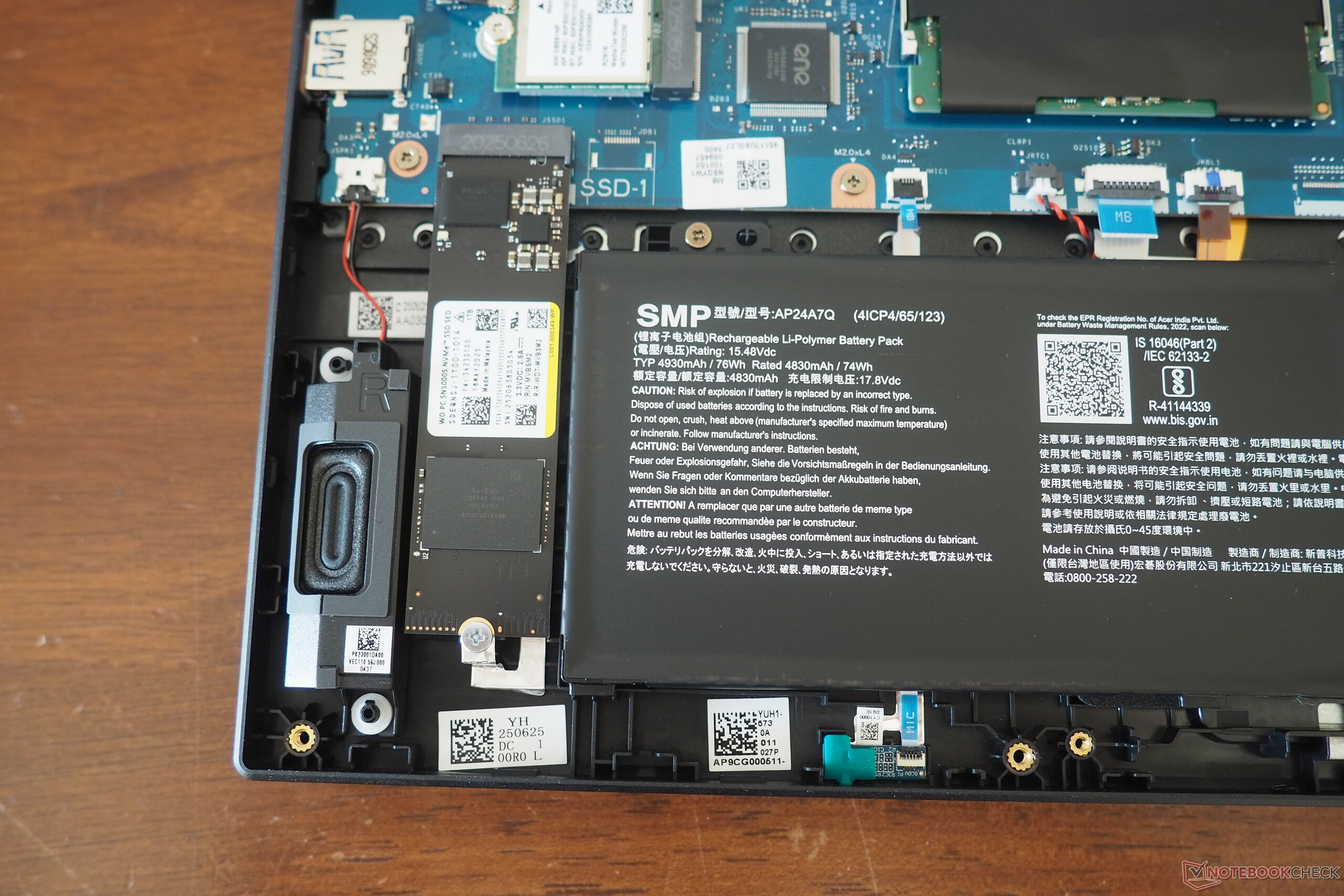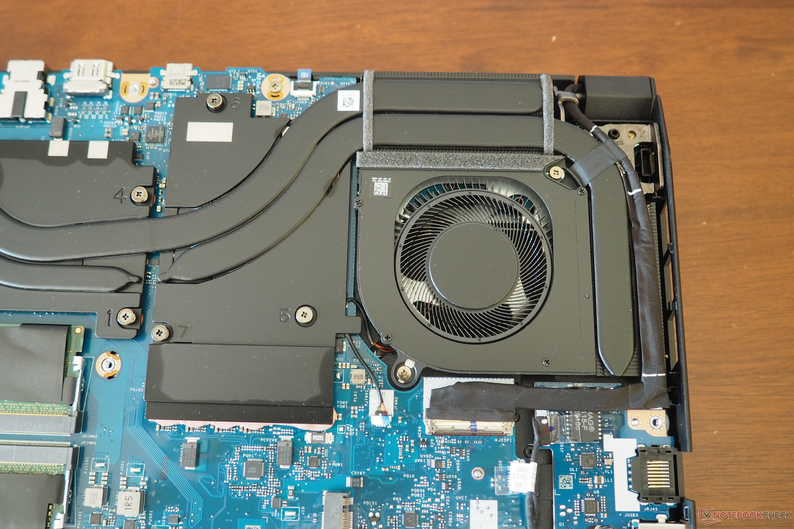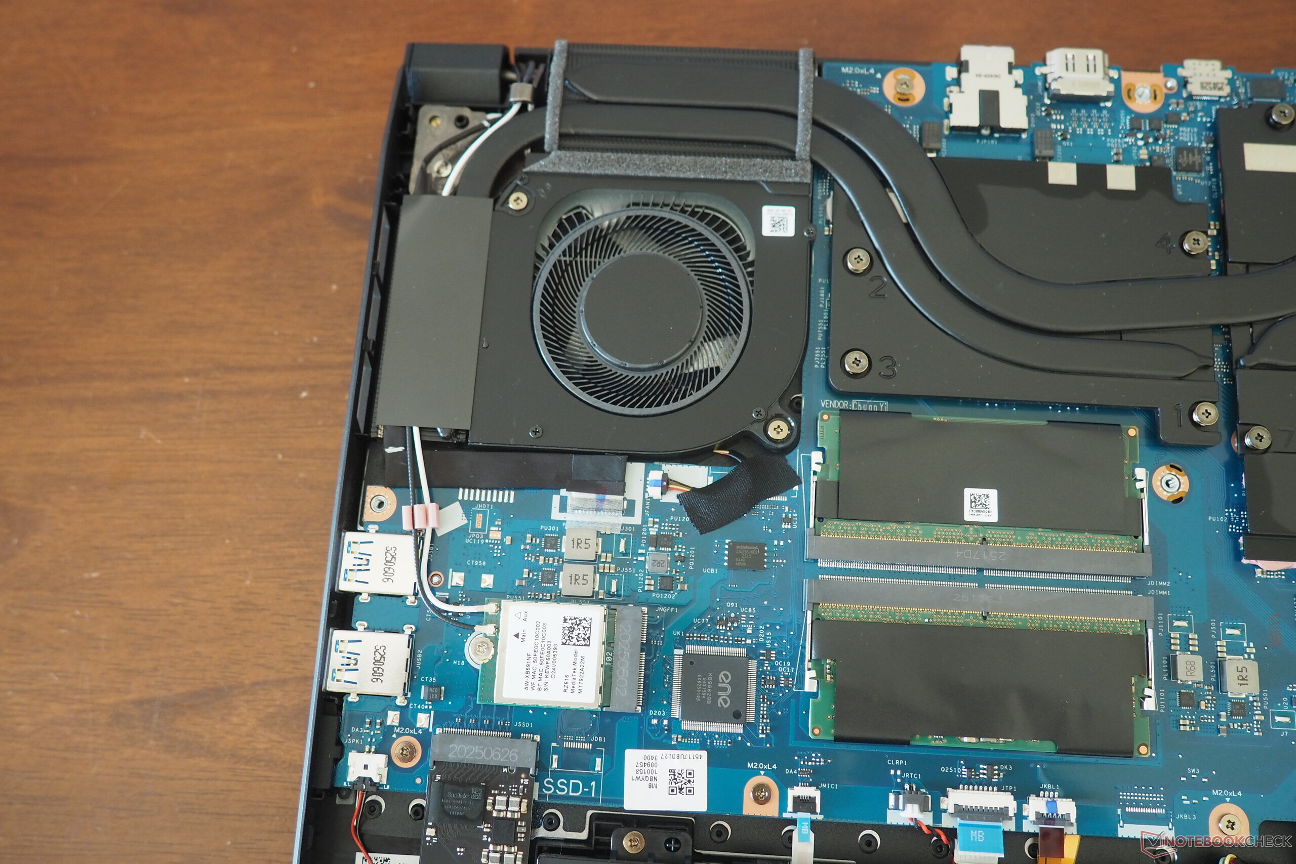 Totalt 10 Phillips-skruvar måste lossas för att komma åt det inre arbetet. Under huven finns förutom kylsystemet med sina två fläktar även den trådlösa modulen, batteriet, två SO-DIMM- och två M.2-platser.