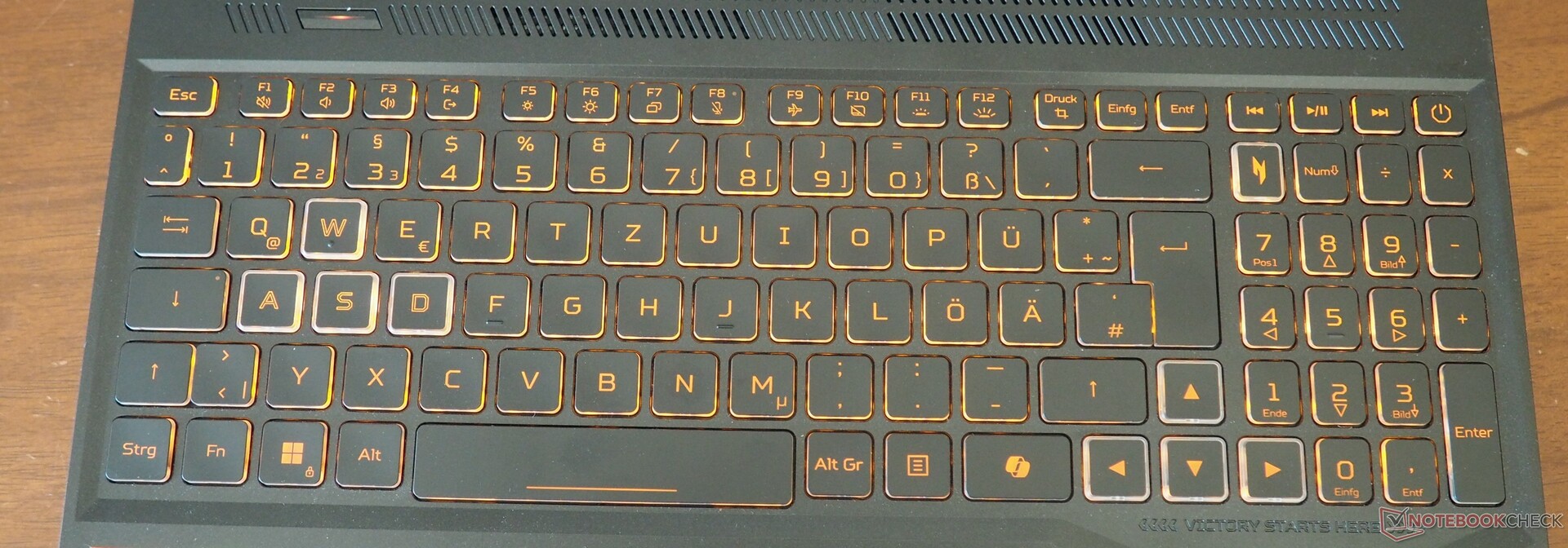 Den maximala öppningsvinkeln på ca 145° är högre än vad som brukar ses i den här klassen. Tangentbordets belysning är orange för att matcha bokstävernas färg på tangenterna.