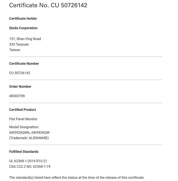 I det här skedet har TÜV Rheinland bara avslöjat spelmonitorns modellnummer. Tidpunkten för denna TÜV Rheinland-certifiering tyder dock på att Alienware AW3926QW har samma WOLED-panel som UltraGear evo 39GX950B ( för närvarande 1 799 USD på Amazon). Om så är fallet kommer AW3926QW att ha en upplösning på 5 120 x 2 160 (5 K2K) med en uppdateringsfrekvens på 165/330 Hz i Dual Mode och en maximal ljusstyrka på upp till 1 500 nits. Vänligen se vår artikel om lanseringen av UltraGear evo 39GX950B för mer information.