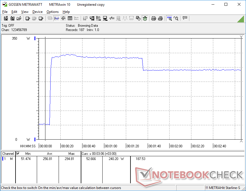 Vi kan registrera ett maximalt uttag på 339 W när både CPU och GPU är 100 procent utnyttjade. Den skrymmande nätadaptern (~19,5 x 9,8 x 4 cm) är dimensionerad för 330 W och vår fullt konfigurerade enhet utnyttjar alltså den tillgängliga strömmen maximalt. Tänk på att laddningshastigheten för den bärbara datorns batteri saktar ner när du spelar. Faktum är att vi kan observera att vårt batteri sjunker från 100 procent till 91 procent när vi kör extremt krävande belastningar som Prime95 och FurMark samtidigt.