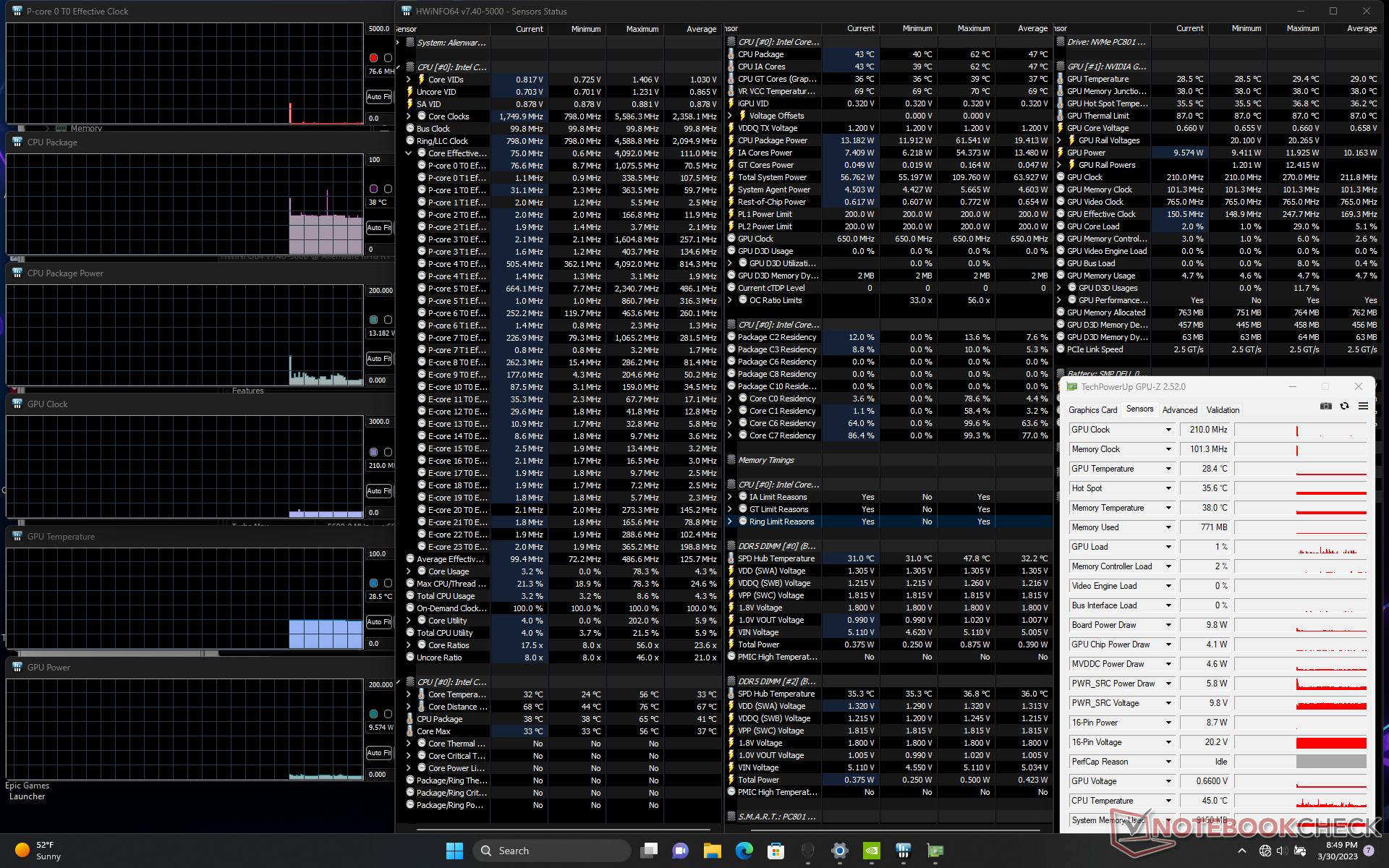 Körning av Witcher 3 för att representera typiska spelbelastningar drar 311 W eller över 50 W mer än på förra årets RTX 3080 Ti-drivna Alienware x17 R2. Även om prestandan är snabbare från generation till generation får användarna alltså betala för det genom högre elräkningar på grund av den mer krävande processorn.