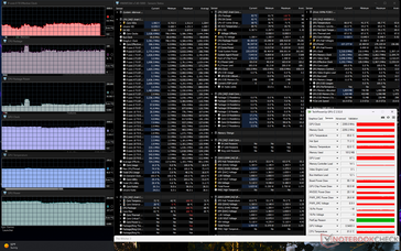 När Prime95 körs för att stressa CPU:n, stiger klockfrekvensen och strömförbrukningen på kortet till 4,5 GHz respektive 198 W, vilket bara varar i några sekunder eller tills kärntemperaturen når 99 C. Därefter sjunker CPU:n till 4,2 GHz och 175 W under de närmaste minuterna innan den slutligen stabiliseras på 3,4 GHz, 143 W och 99 C. Maximal Turbo Boost är därför inte hållbar oavsett strömläge. CPU-temperaturerna är också extrema även för en bärbar dator för spel.