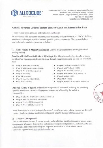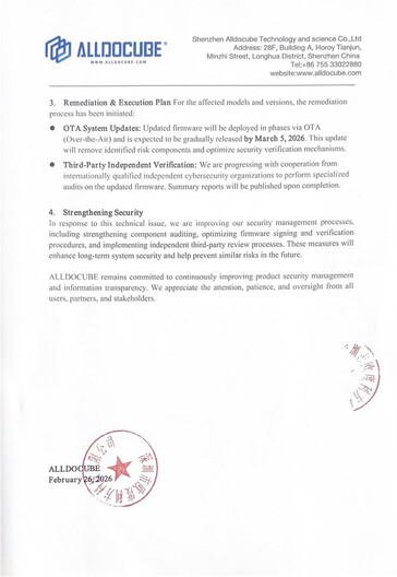 Enheter som inte är i någon omedelbar fara, enligt Alldocubes undersökningar, finns i ovanstående dokument. Alldocube har utlovat OTA firmware-uppdateringar senast den 5 mars 2026 för de berörda enheterna och kommer också att organisera tredjepartsrevisioner för att säkerställa säkerhets- och säkerhetsstandarder för de uppdaterade firmware.