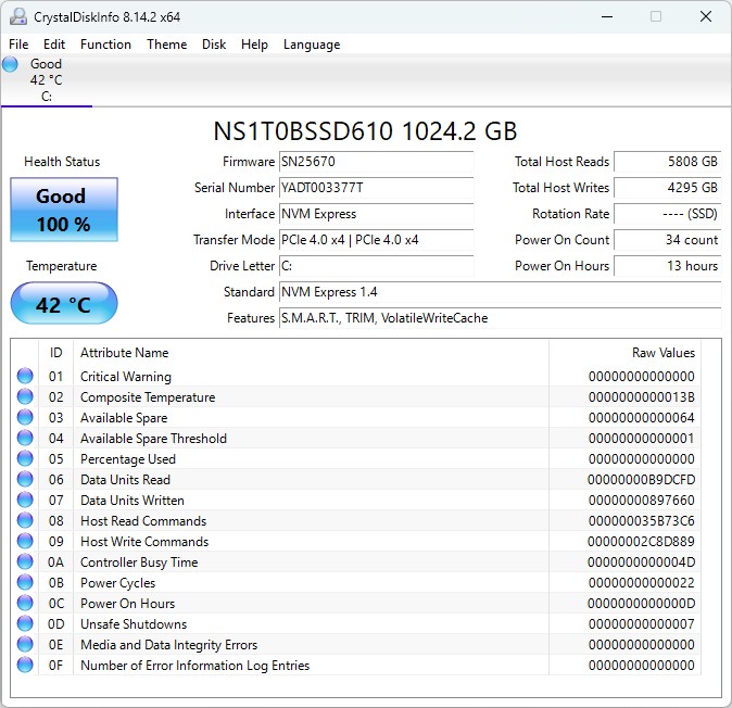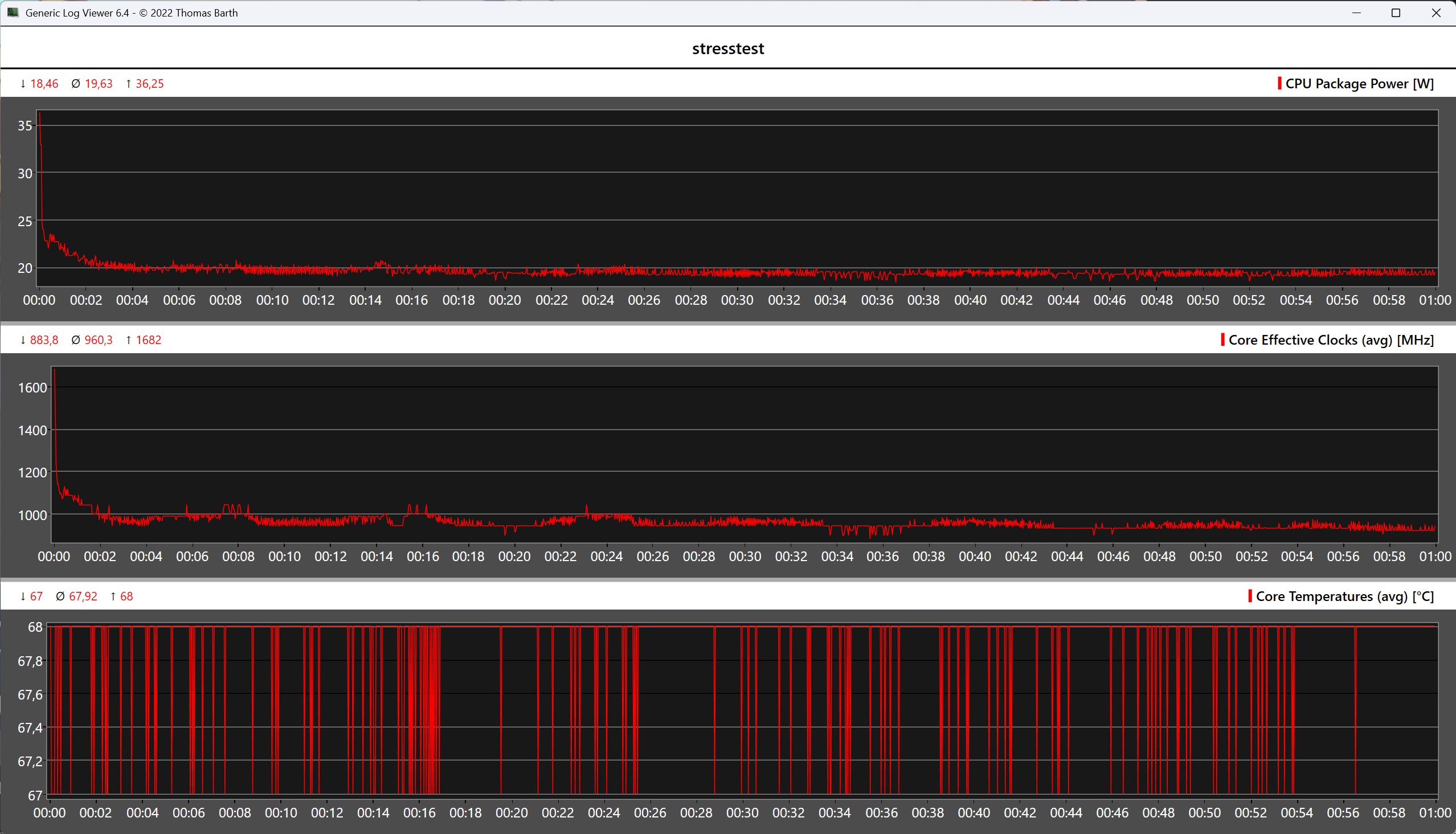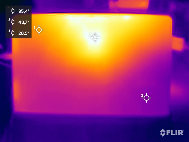 Yttemperaturerna på iWork GT Ultra är överlag okritiska. Under full belastning uppmätte vi maximalt cirka 46 °C på baksidan, vilket är märkbart men inte störande vid daglig användning. I stresstestet med kombinerad CPU- och GPU-belastning når SoC kortvarigt en strömförbrukning på cirka 36 watt innan den snabbt planar ut på cirka 19 watt.