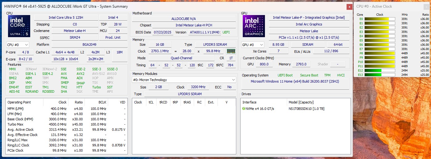 | Alldocube iWork GT Ultra Intel Core Ultra 5 125H ⎘ Intel Arc 7-Core iGPU ⎘ 16 GB Minne, 1024 GB SSD | Amazon: Listpris: 799€ | 870 g | 9.89 mm | 13.00" 2560x1600 232 PPI IPS | |