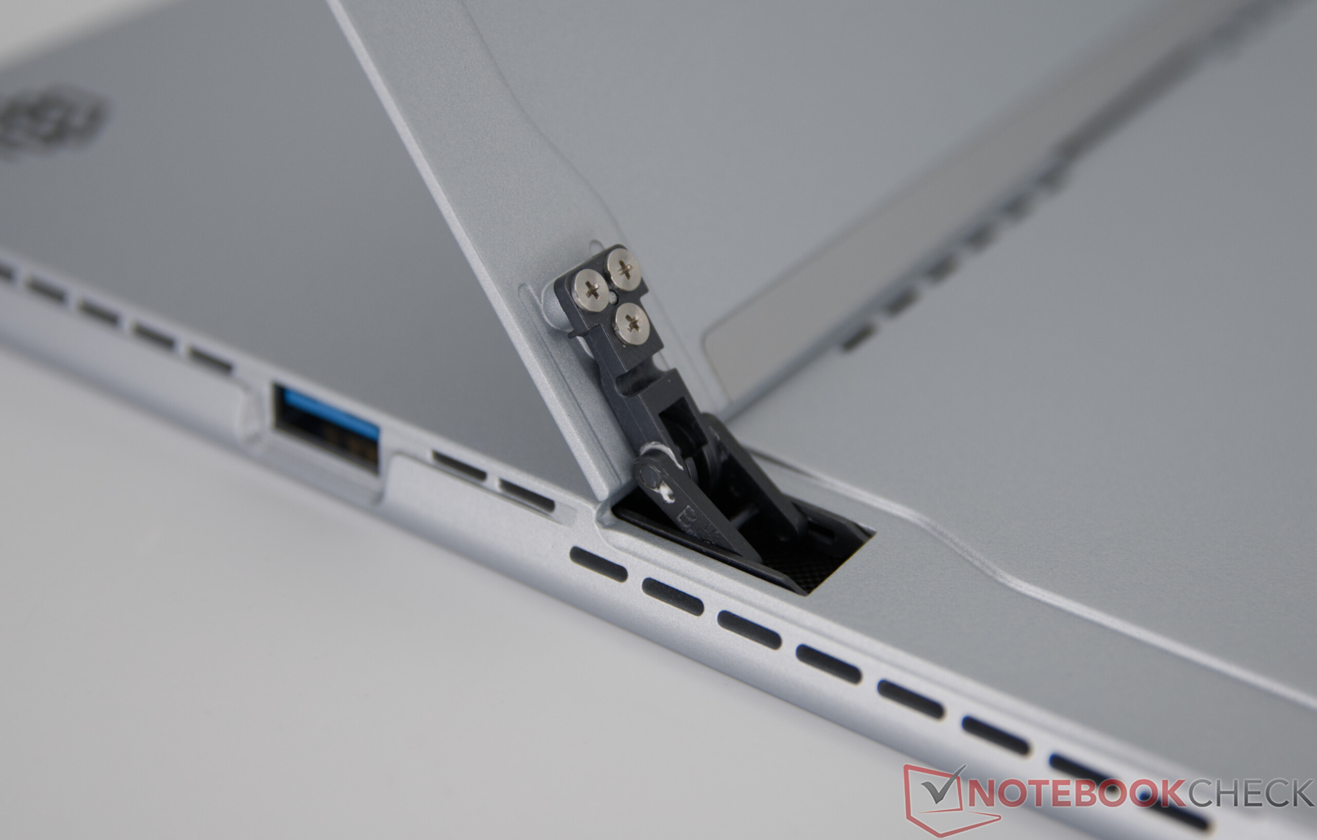 IWork GT Ultra levereras med ett integrerat stöd. Alldocube förlitar sig på ett metallhölje som skapar ett högkvalitativt helhetsintryck. Under hårt tryck finns det dock en viss flexibilitet: små knarrande ljud när du vrider och en något eftergivlig skärm märks, men har ingen negativ effekt i vardagen - allt förblir stabilt även med normala pekinmatningar. Det gångjärnsförsedda stativet på baksidan är stabilt och påminner om en Microsoft-surfplatta.