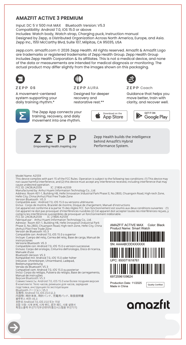 Nu har Amazfit Active 3 Premium smartwatch dykt upp igen, den här gången i en ansökan på Federal Communications Commission (FCC) i USA. I dokumenten hänvisas det till som modell A2559, med en skiss av produktens förpackning (skärmdump nedan) som bekräftar namnet "Amazfit Active 3 Premium".