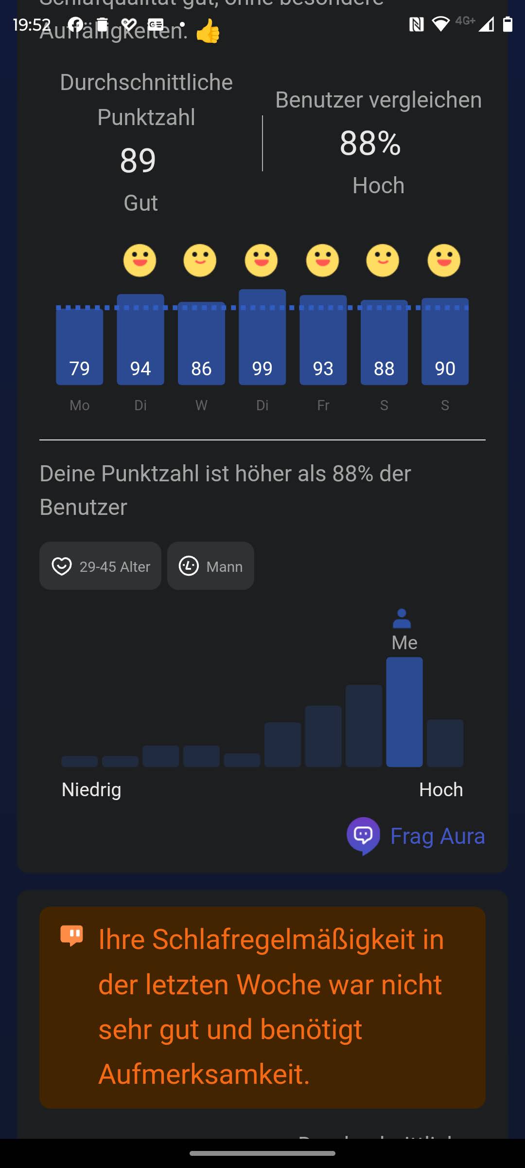 Aura är en AI-stödd assistent som främst fokuserar på sömnrelaterade funktioner. Förutom att tillhandahålla analyser av veckostatistik eller djupa sömnfaser fungerar Aura som en chatbot. De skriftliga svaren finns på tyska, men språkversionen är för närvarande begränsad till engelska. Aura rekommenderar musik för avslappning och utformar en personlig sömnplan. Priset för tjänsten är ~10 USD per månad eller ~75 USD per år, med en kostnadsfri provperiod på sju dagar. Det är värt att notera att Auras virtuella assistent lagras i molnet, vilket möjliggör dataanalys utanför smarttelefonen.